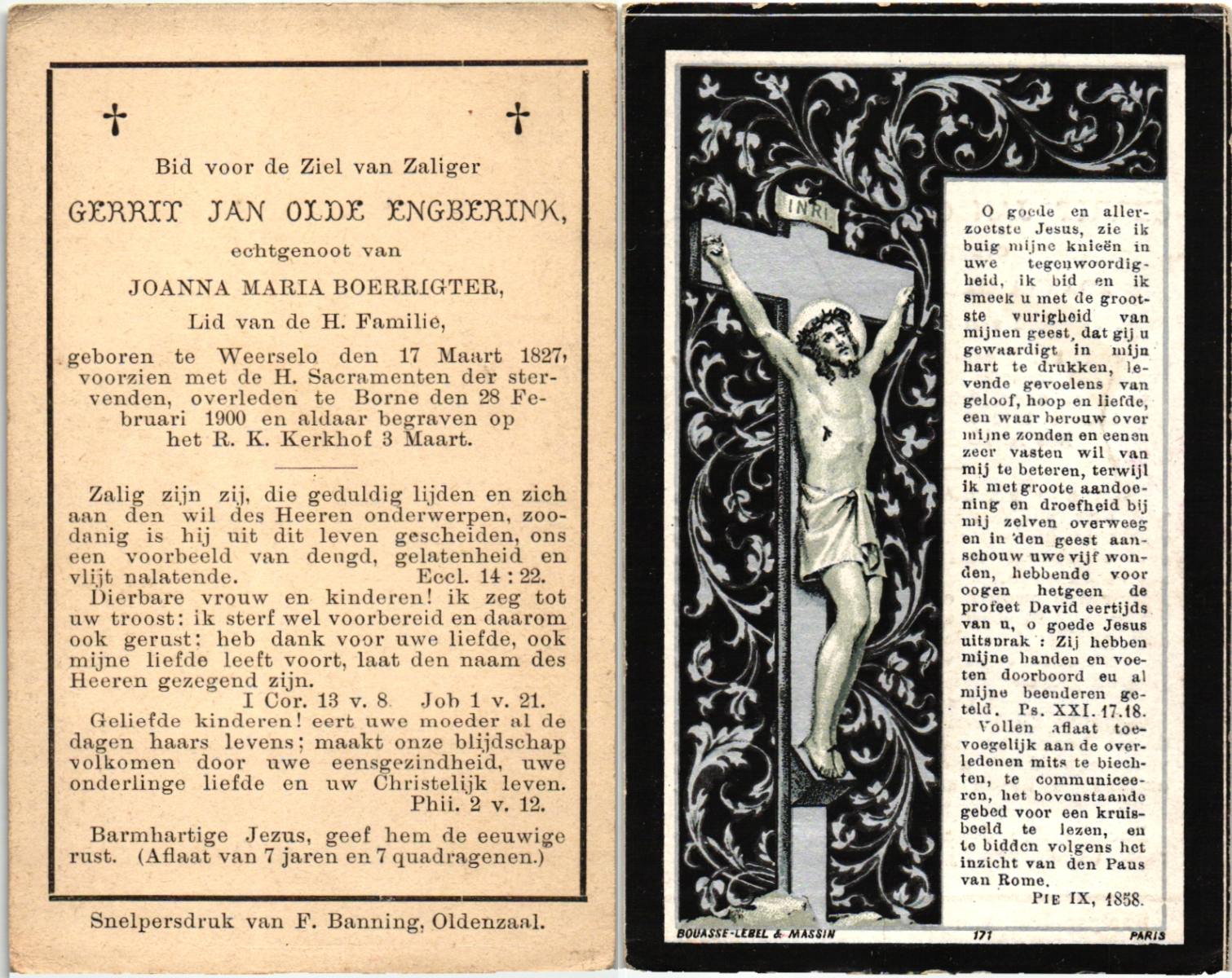 OLDE ENGBERINK, , Gerrit Jan, geboren op 17-03-1827 te Weerselo, overleden op 28-2-1900 te Borne op 72-jarige leeftijd, begraven op 3-3-1900 te Borne.