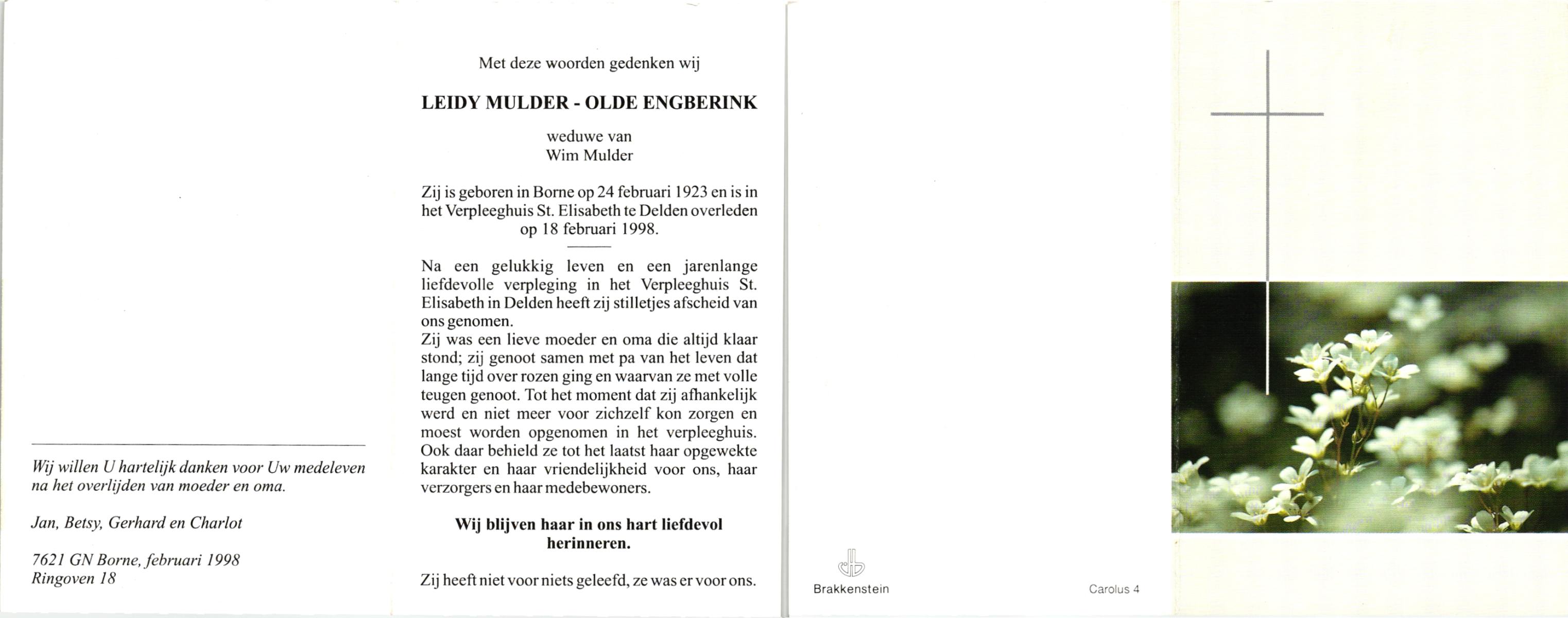 OLDE ENGBERINK, , Leidy, geboren op 24-2-1923 te Borne, overleden op 18-2-1998 te Delden op 74-jarige leeftijd.