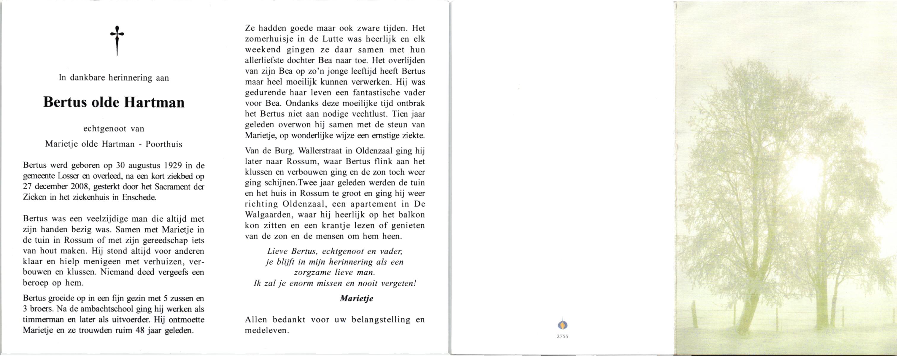 OLDE HARTMAN, , Bertus, geboren op 30-8-1929 te Losser, overleden op 27-12-2008 te Enschede op 79-jarige leeftijd.