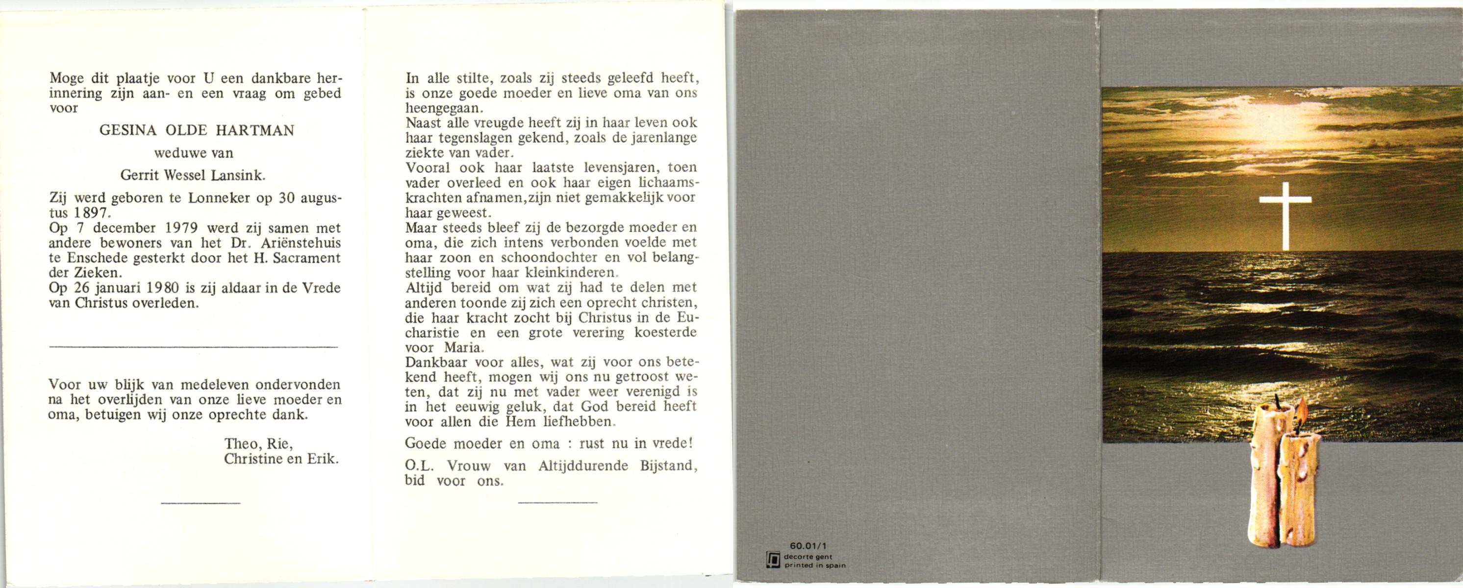OLDE HARTMAN, , Gesina, geboren op 30-08-1897 te Lonneker, overleden op 26-1-1980 te Enschede op 82-jarige leeftijd.