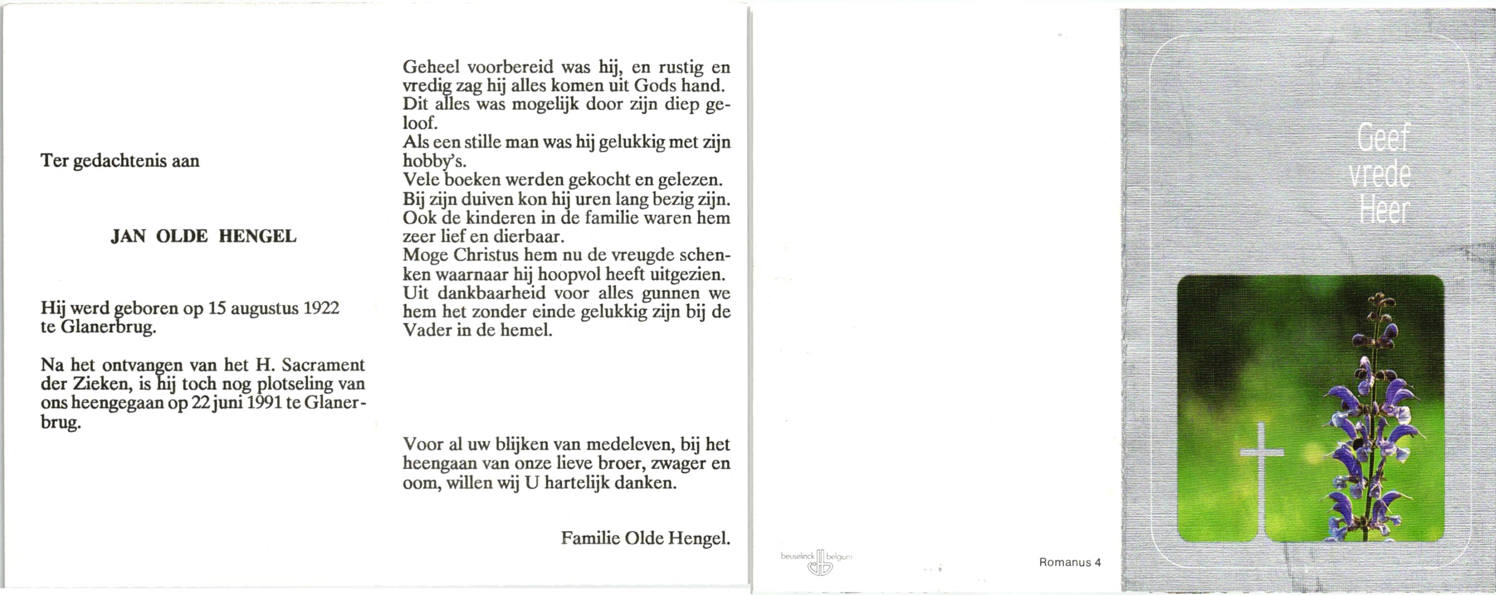OLDE HENGEL, , Jan, geboren op 15-8-1922 te Glanerbrug, overleden op 22-6-1991 te Glanerbrug op 68-jarige leeftijd.