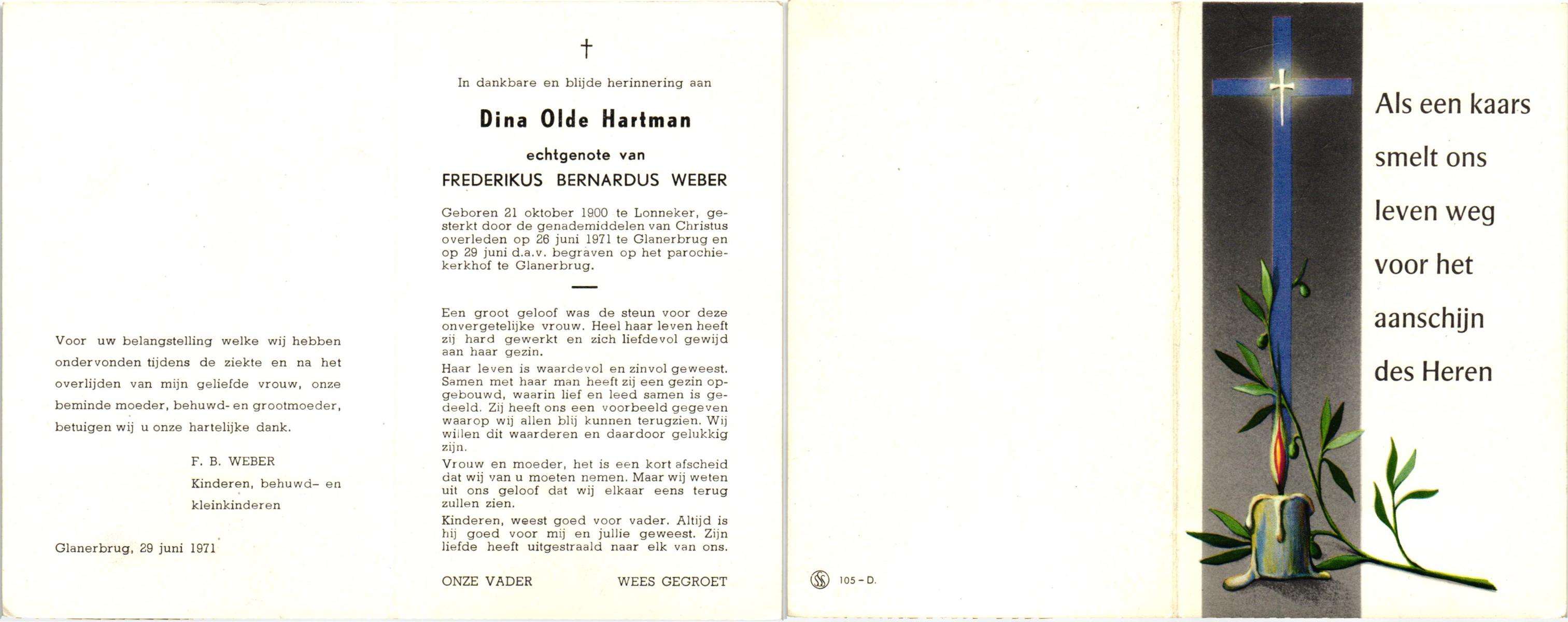 OLDE HARTMAN, Dina, geboren op 21-10-1900 te Lonneker, overleden op 26-6-1971 te Glanerbrug op 70-jarige leeftijd, begraven op 29-6-1971 te Glanerbrug.
