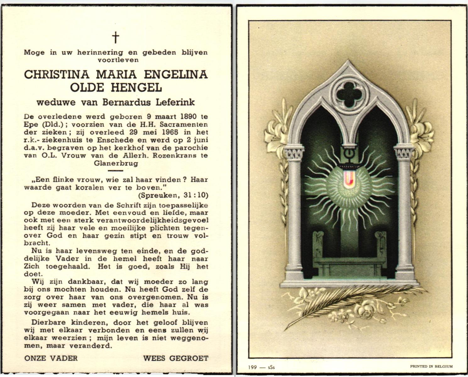 OLDE HENGEL, Christina Maria Engelina, geboren op 09-03-1890 te Epe, Dld, overleden op 29-5-1968 te Enschede, ziekenhuis op 78-jarige leeftijd, begraven op 2-6-1968 te Glanerbrug.