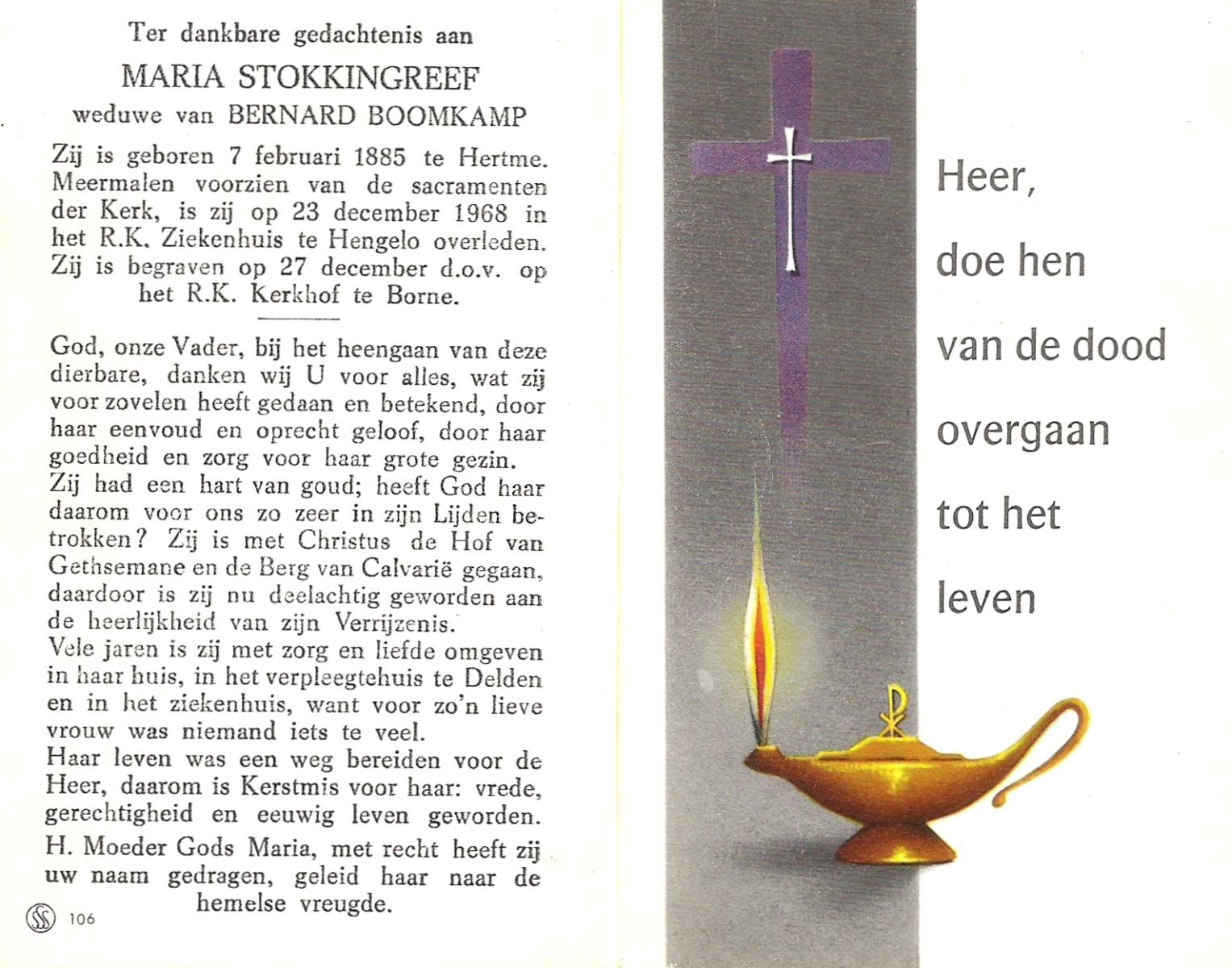 STOKKINGREEF, Maria, geboren op 07-02-1885 te Hertme, overleden op 23-12-1968 te Hengelo (Ov.) op 83-jarige leeftijd, begraven op 27-12-1968 te Borne.