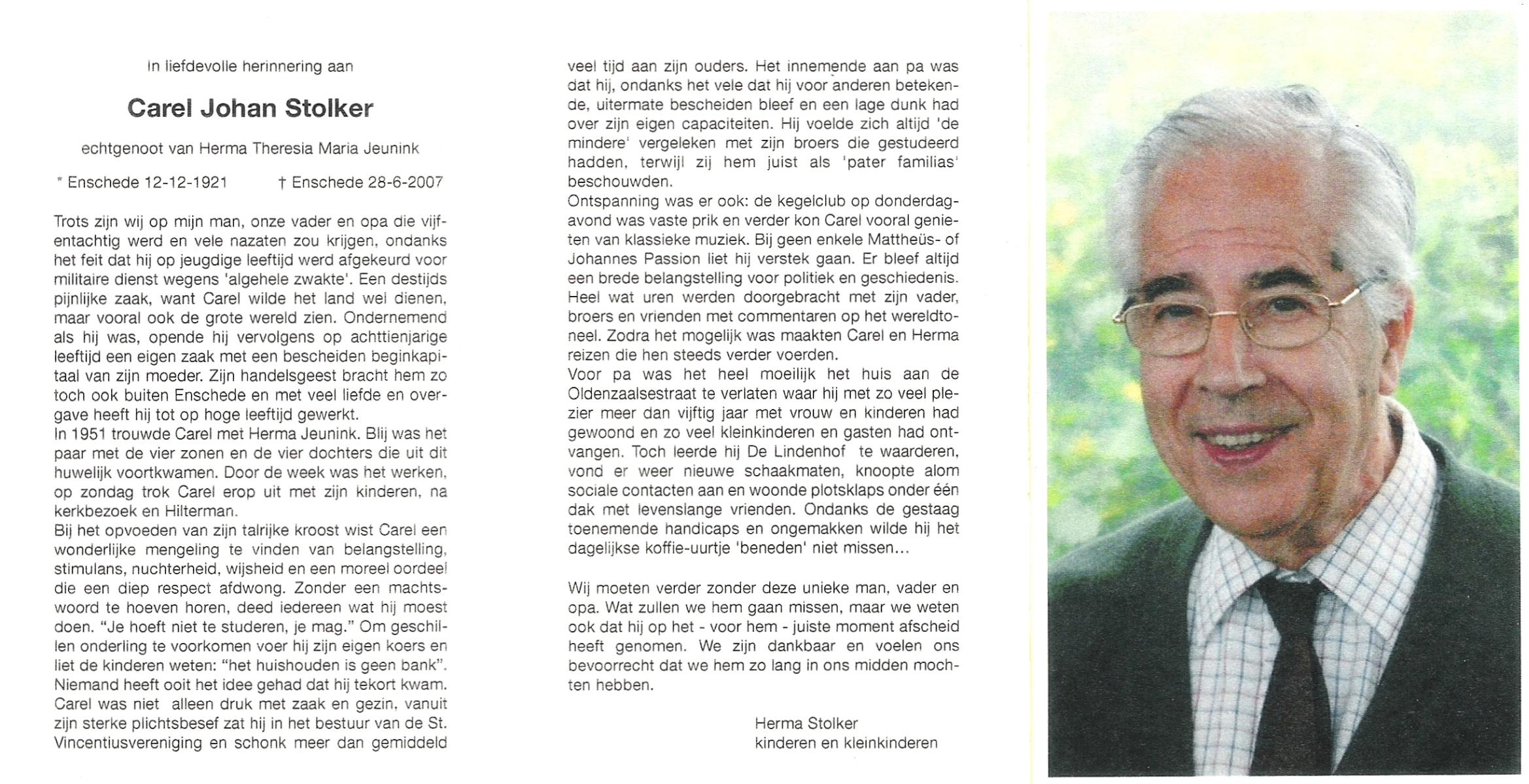 STOLKER, Carel Johan, geboren op 12-12-1921 te Enschede, overleden op 28-6-2007 te Enschede op 85-jarige leeftijd.