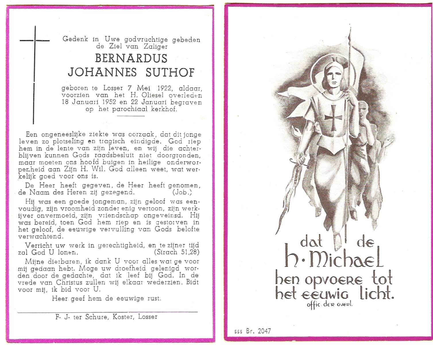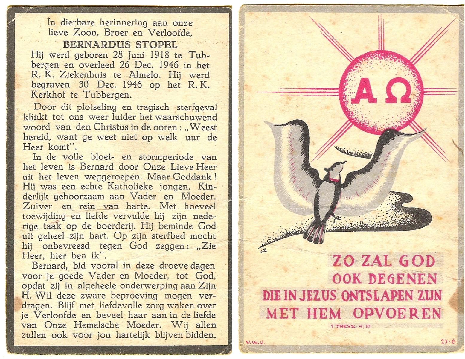 STOPEL, Bernardus, geboren op 28-6-1918 te Tubbergen, overleden op 26-12-1946 te Almelo op 28-jarige leeftijd, begraven op 30-12-1946 te Tubbergen.