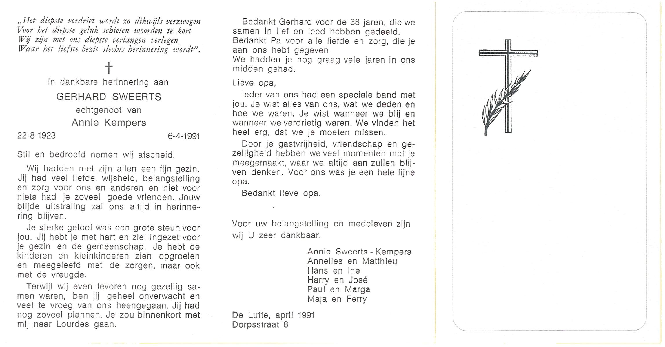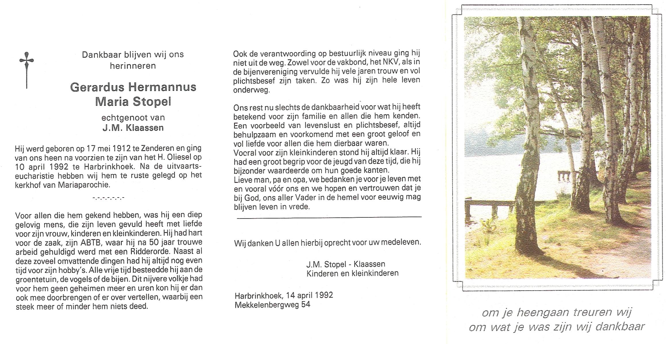 STOPEL, Gerardus Hermanus, geboren op 17-5-1912 te Zenderen, overleden op 10-4-1992 te Harbrinkhoek op 79-jarige leeftijd, begraven te Mariaparochie.