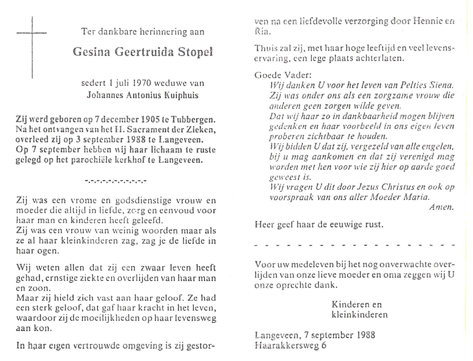 STOPEL, Gesina Geertruida, geboren op 7-12-1905 te Tubbergen, overleden op 3-9-1988 te Langeveen op 82-jarige leeftijd, begraven op 7-9-1988 te Langeveen.