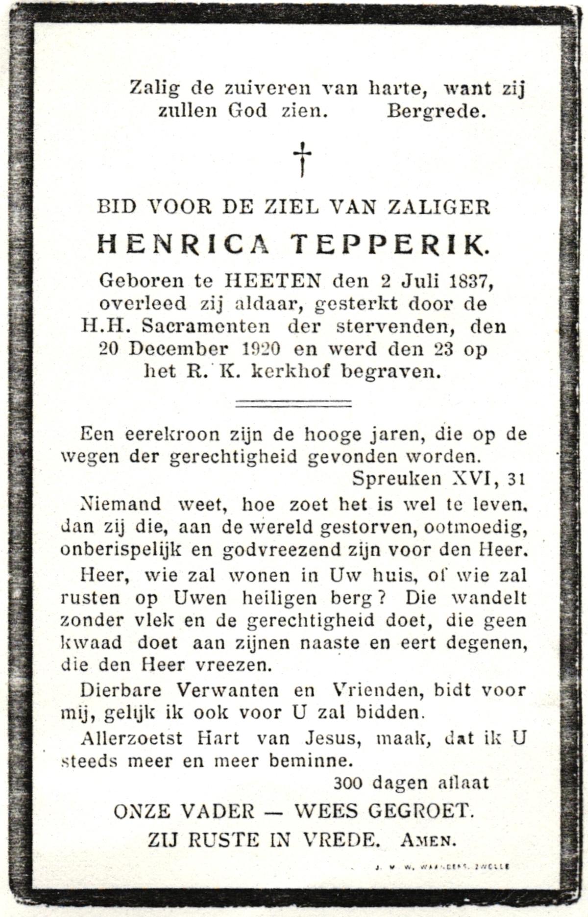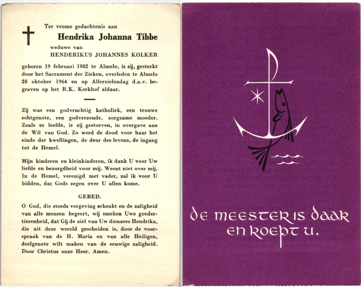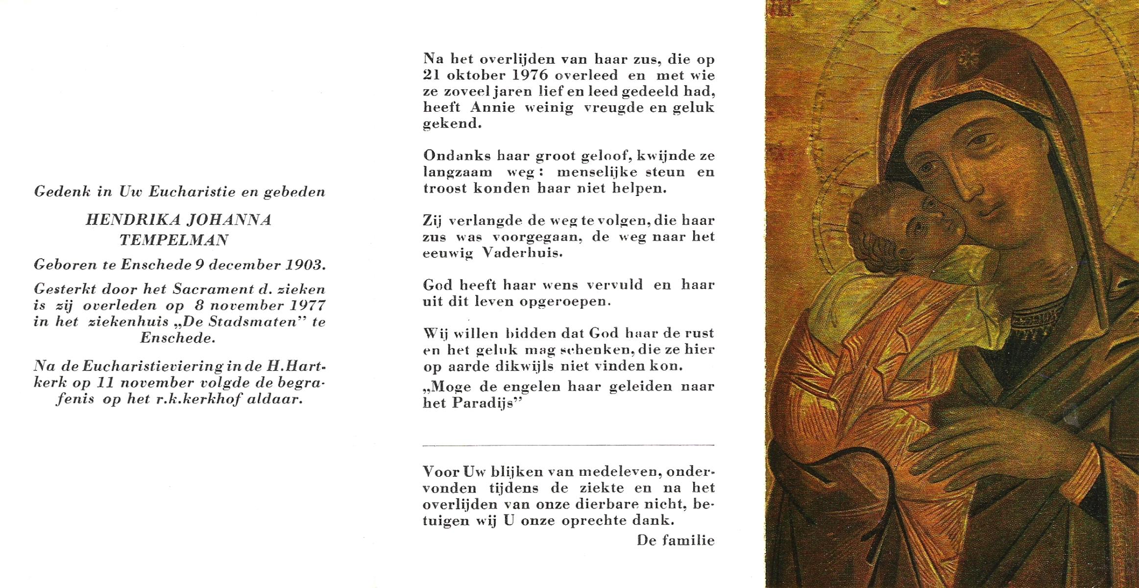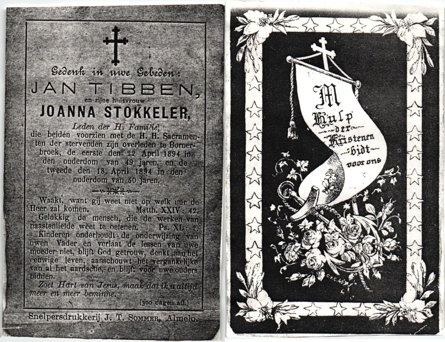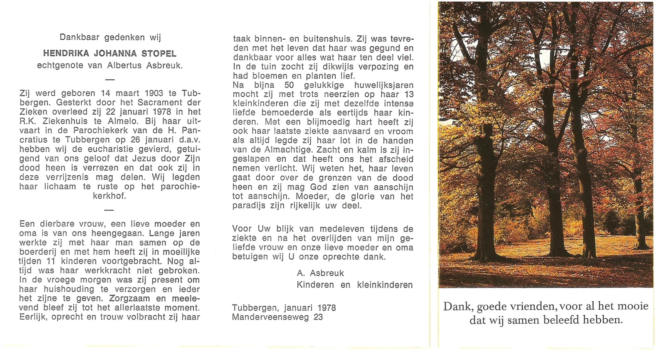 STOPEL, Hendrika Johanna, geboren op 14-3-1903 te Tubbergen, overleden op 22-1-1978 te Almelo op 74-jarige leeftijd, begraven te Tubbergen.