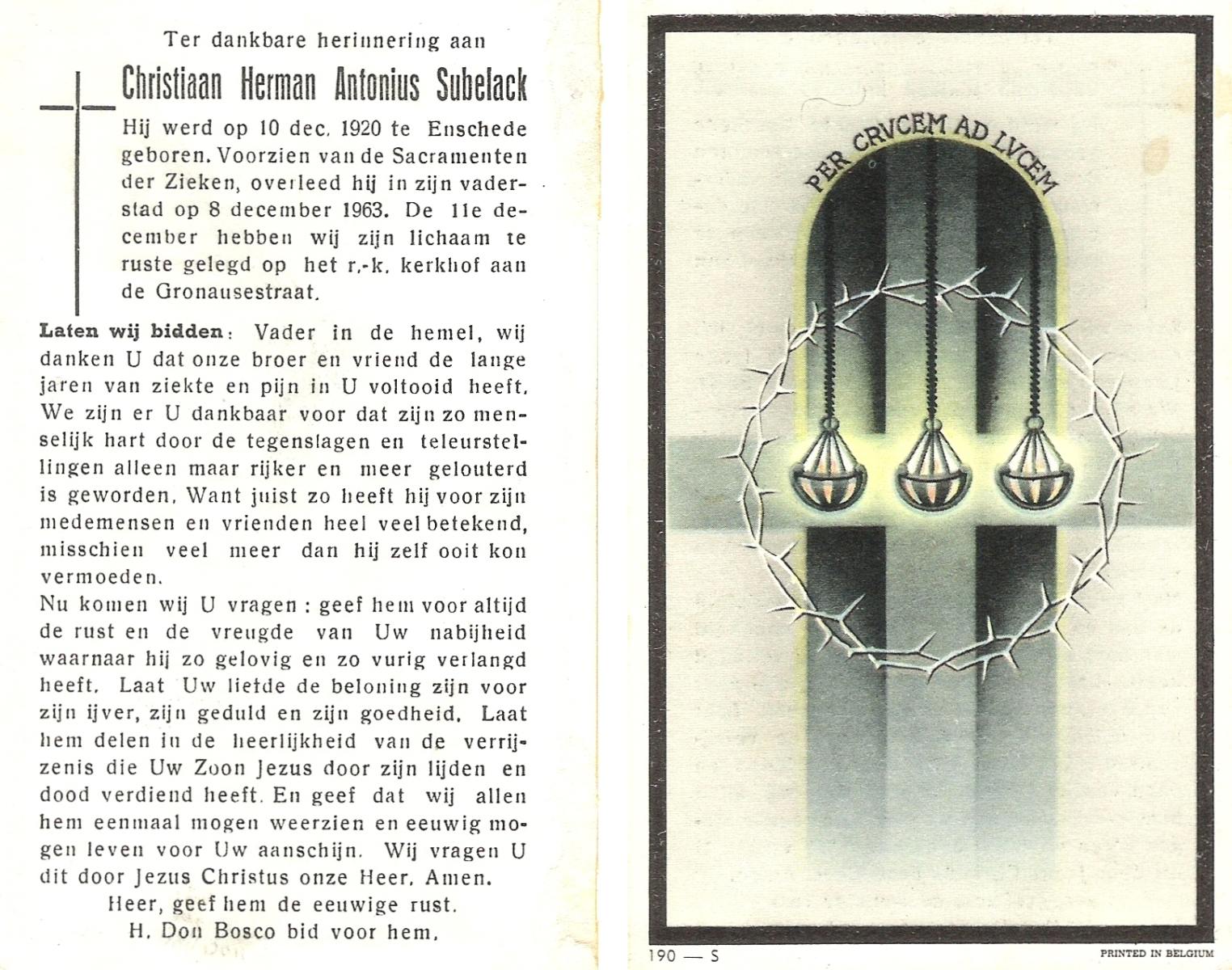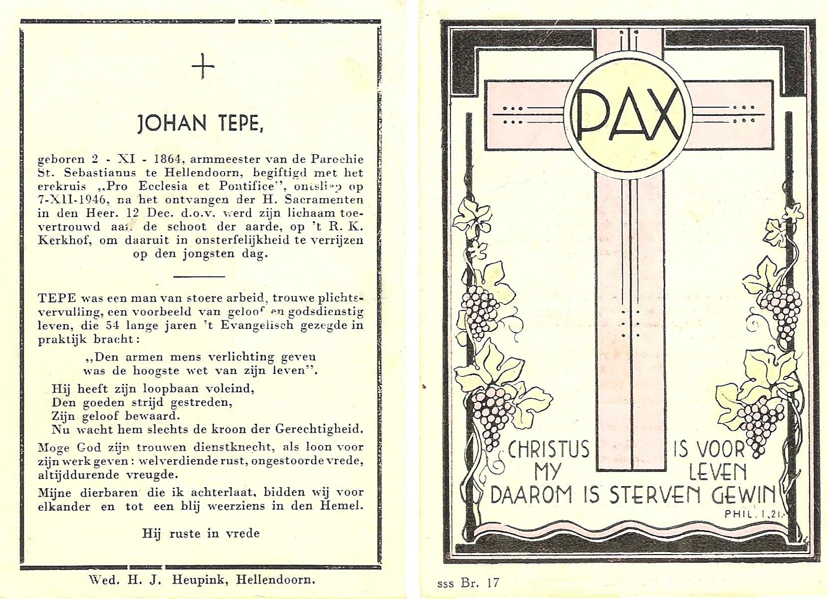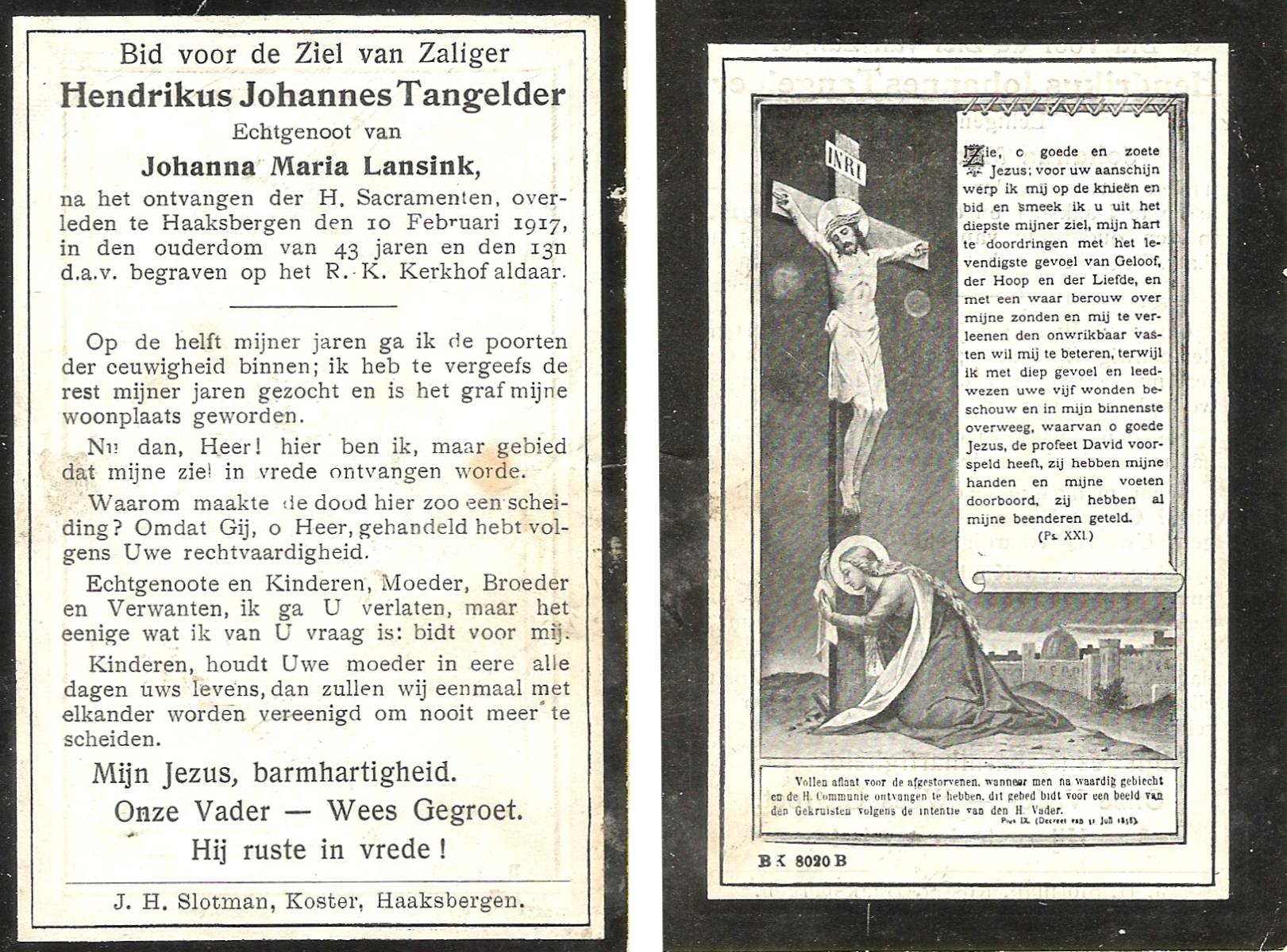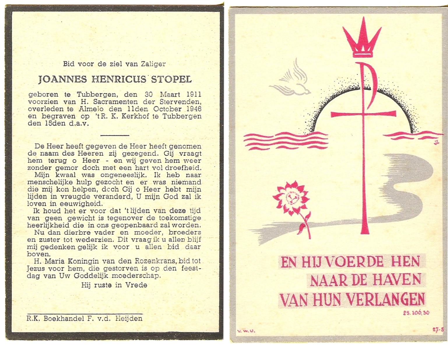 STOPEL, Johannes Henricus, geboren op 30-3-1911 te Tubbergen, overleden op 11-10-1946 te Almelo op 35-jarige leeftijd, begraven op 15-10-1946 te Tubbergen R.K.kerkhof.