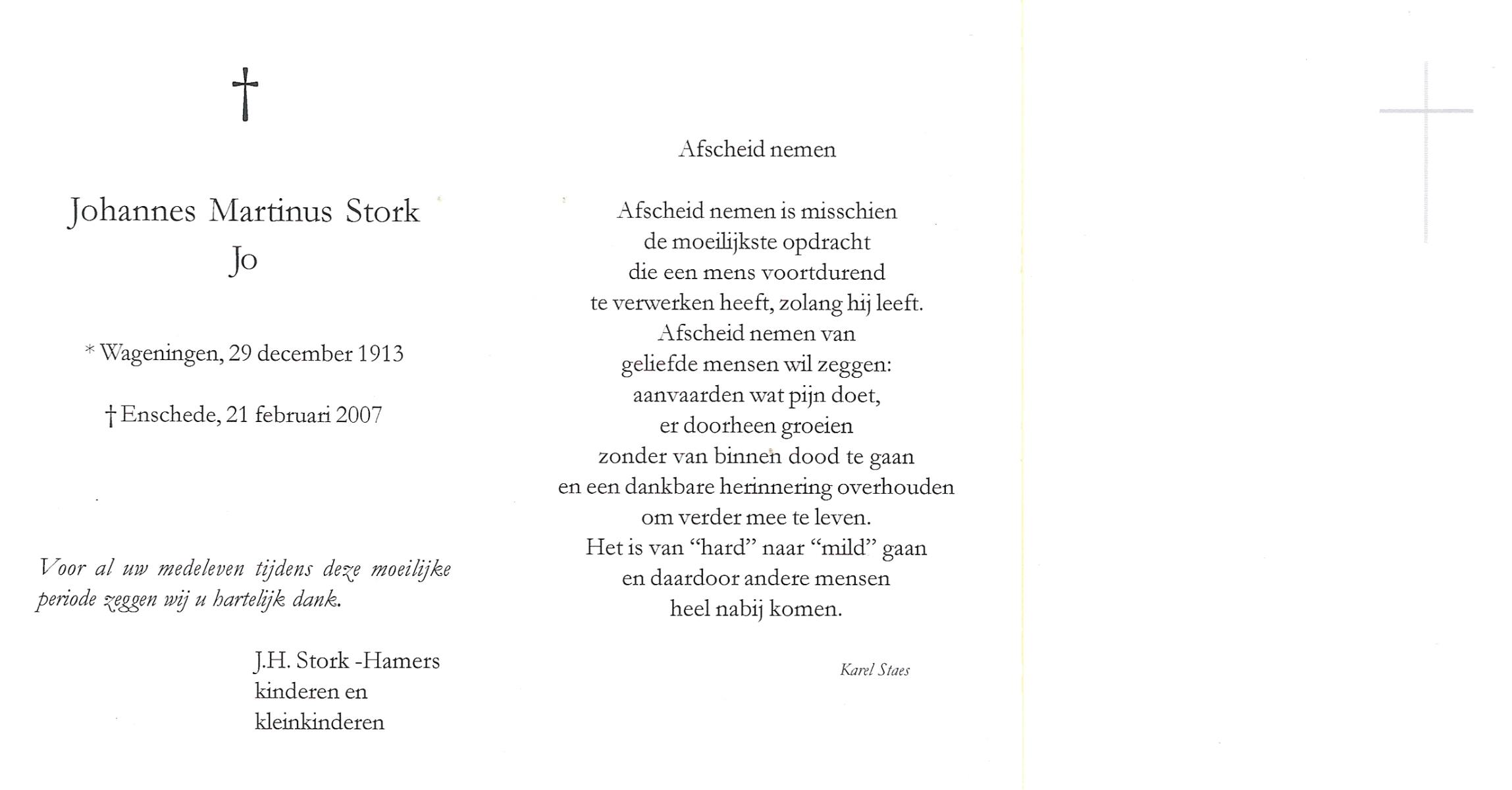 STORK, Johannes Martinus (Jo), geboren op 29-12-1913 te Wageningen, overleden op 21-2-2007 te Enschede op 93-jarige leeftijd.