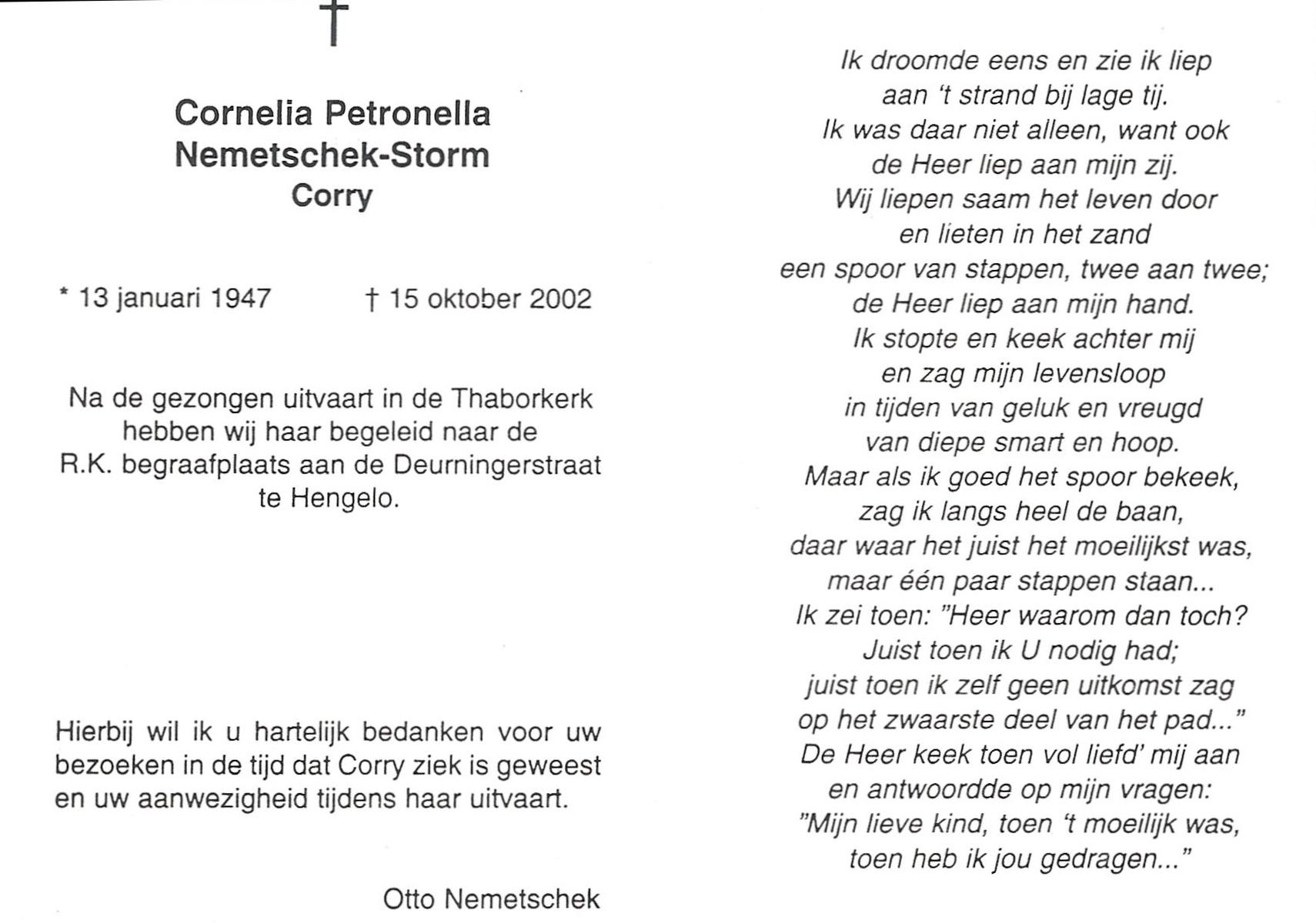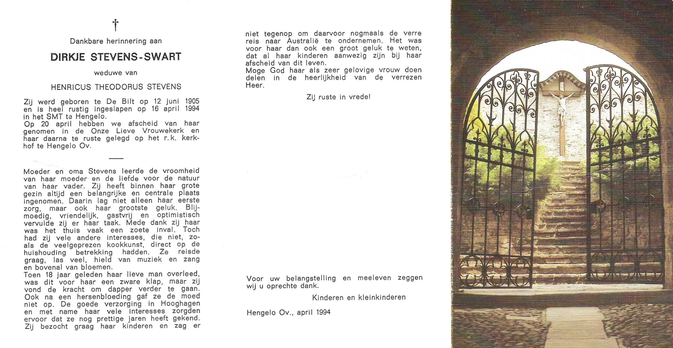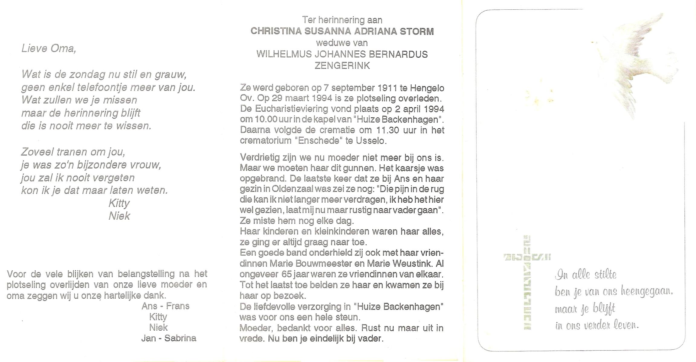 STORM, Christina Susanna Adriana, geboren op 7-9-1911 te Hengelo (O), overleden op 29-3-1994 te Hengelo (Ov.) op 82-jarige leeftijd, gecremeerd op 2-4-1994 te Usselo.