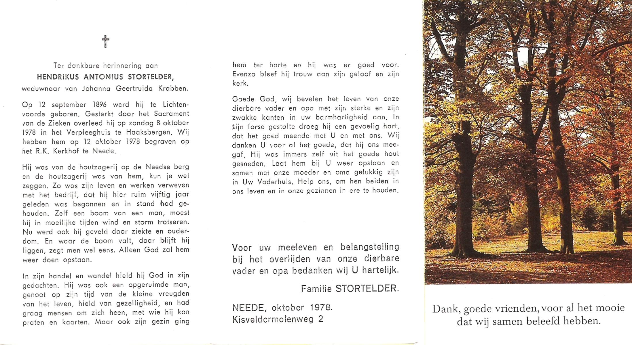 STORTELDER, Hendrikus Antonius, geboren op 12-09-1896 te Lichtenvoorde, overleden op 8-10-1978 te Haaksbergen op 82-jarige leeftijd, begraven op 12-10-1978 te Neede.