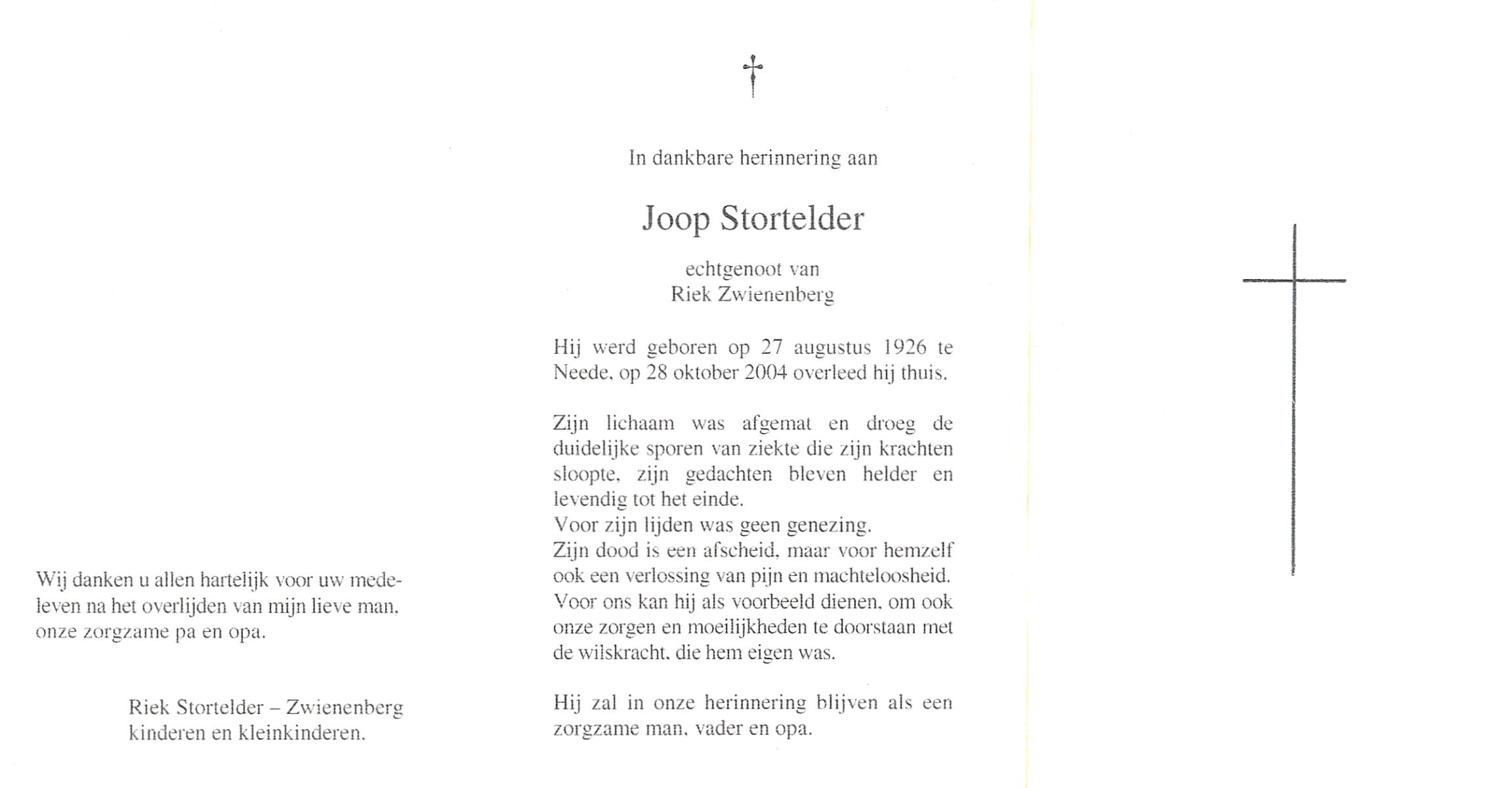 STORTELDER, Joop, geboren op 27-8-1926 te Neede, overleden op 28-10-2004 op 78-jarige leeftijd.