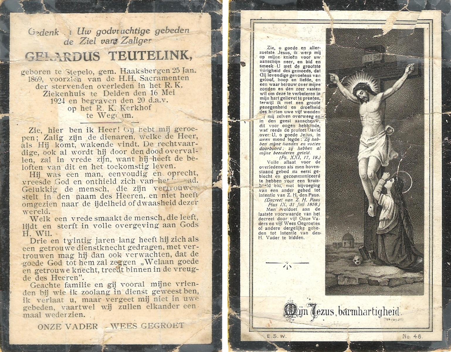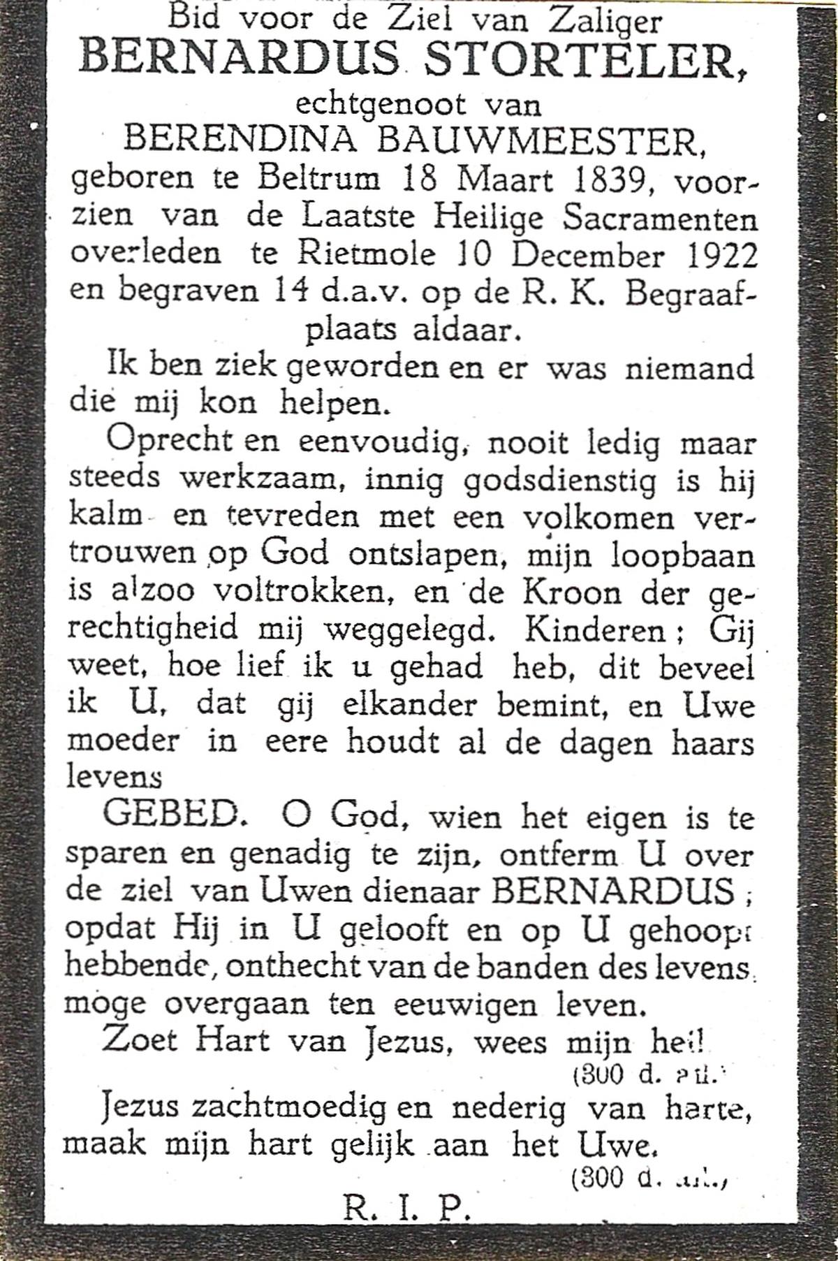 STORTELER, Bernardus, geboren op 18-03-1839 te Beltrum, overleden op 10-12-1922 te Rietmolen op 83-jarige leeftijd, begraven op 14-12-1922 te Rietmolen.