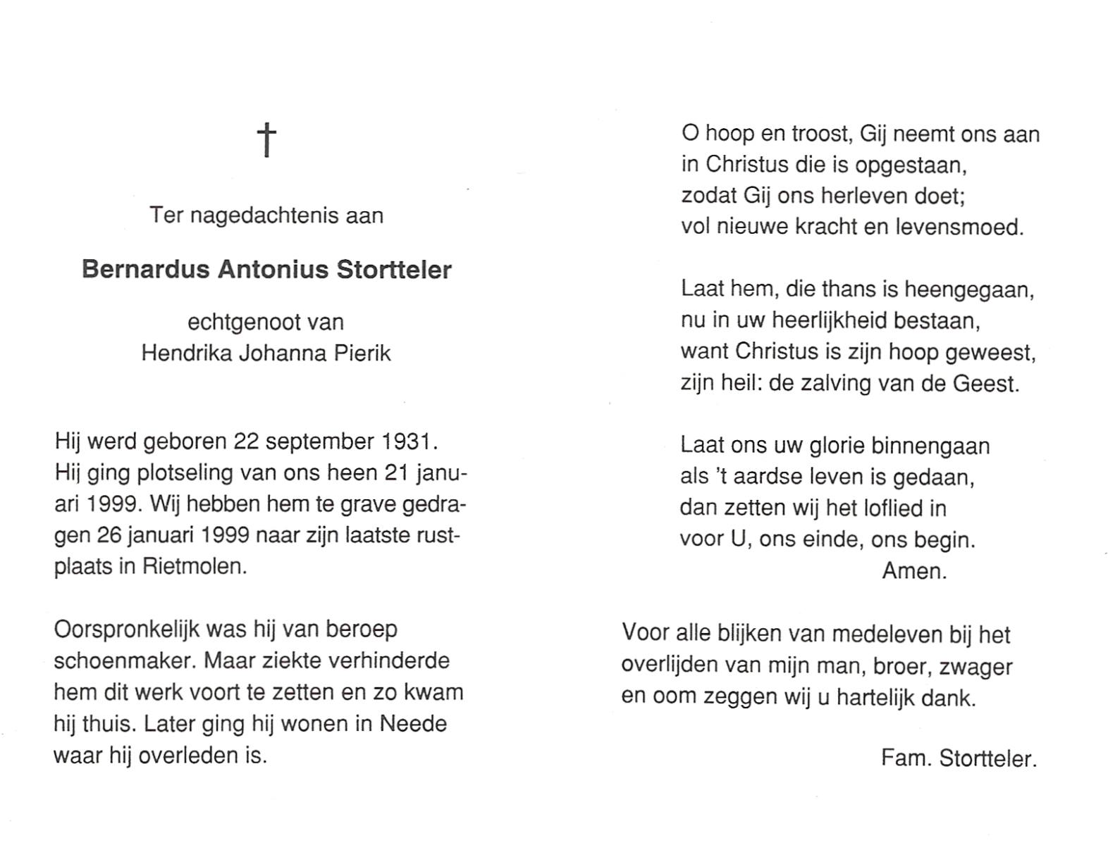 STORTTELER, Bernardus Antonius, geboren op 22-9-1931, overleden op 21-1-1999 te Neede op 67-jarige leeftijd, begraven op 26-1-1999 te Rietmolen.