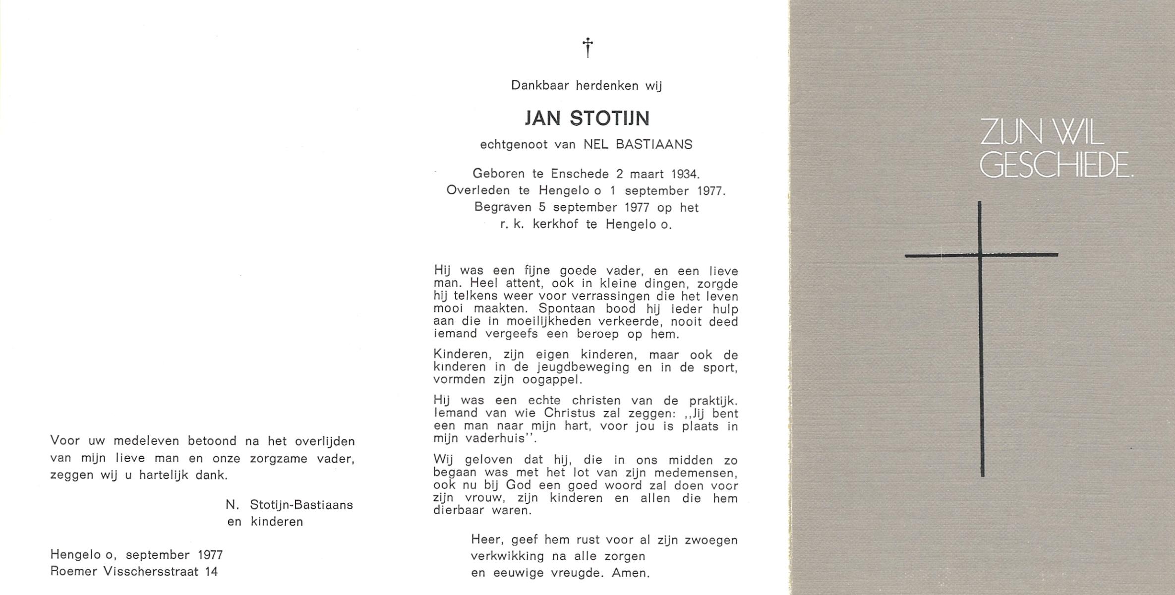 STOTIJN, Jan, geboren op 2-3-1934 te Enschede, overleden op 1-9-1977 te Hengelo (Ov.) op 43-jarige leeftijd, begraven op 5-9-1977 te Hengelo (Ov.).
