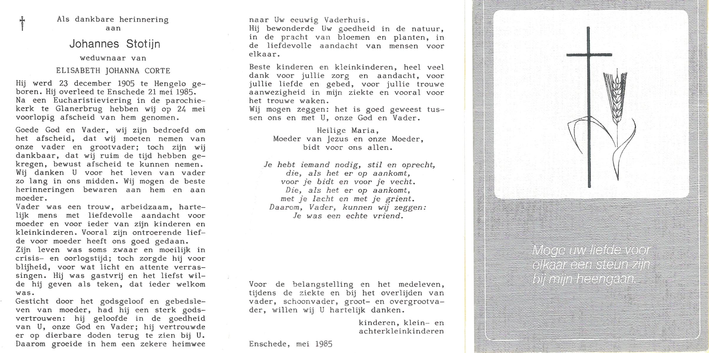 STOTIJN, Johannes, geboren op 23-12-1905 te Hengelo (O), overleden op 21-5-1985 te Enschede op 79-jarige leeftijd, begraven op 24-5-1985 te Glanerbrug.