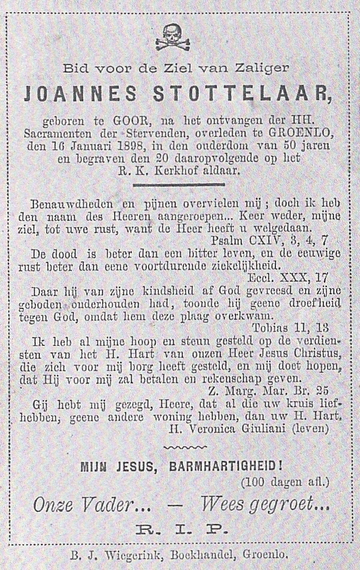 STOTTELAAR, Joannes, geboren te Goor, overleden op 16-01-1898 te Groenlo op 50-jarige leeftijd, begraven op 20-01-1898 te Groenlo.