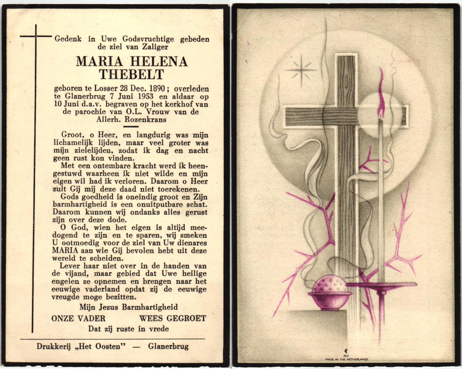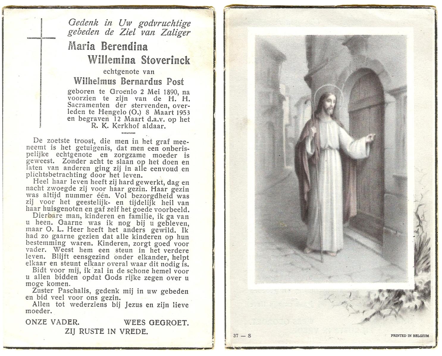 STOVERINCK, Maria Berendina Willemina, geboren op 02-05-1890 te Groenlo, overleden op 8-3-1953 te Hengelo (Ov.) op 62-jarige leeftijd, begraven op 12-3-1953 te Hengelo (O).