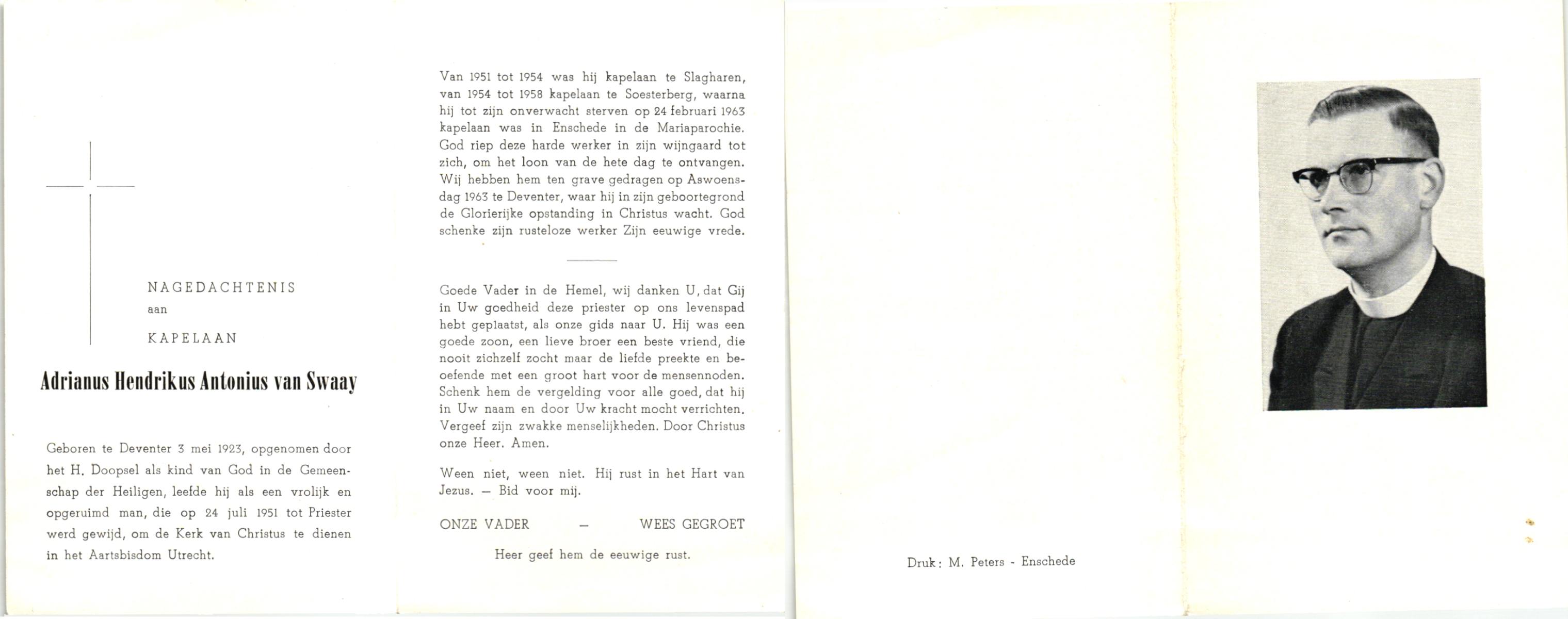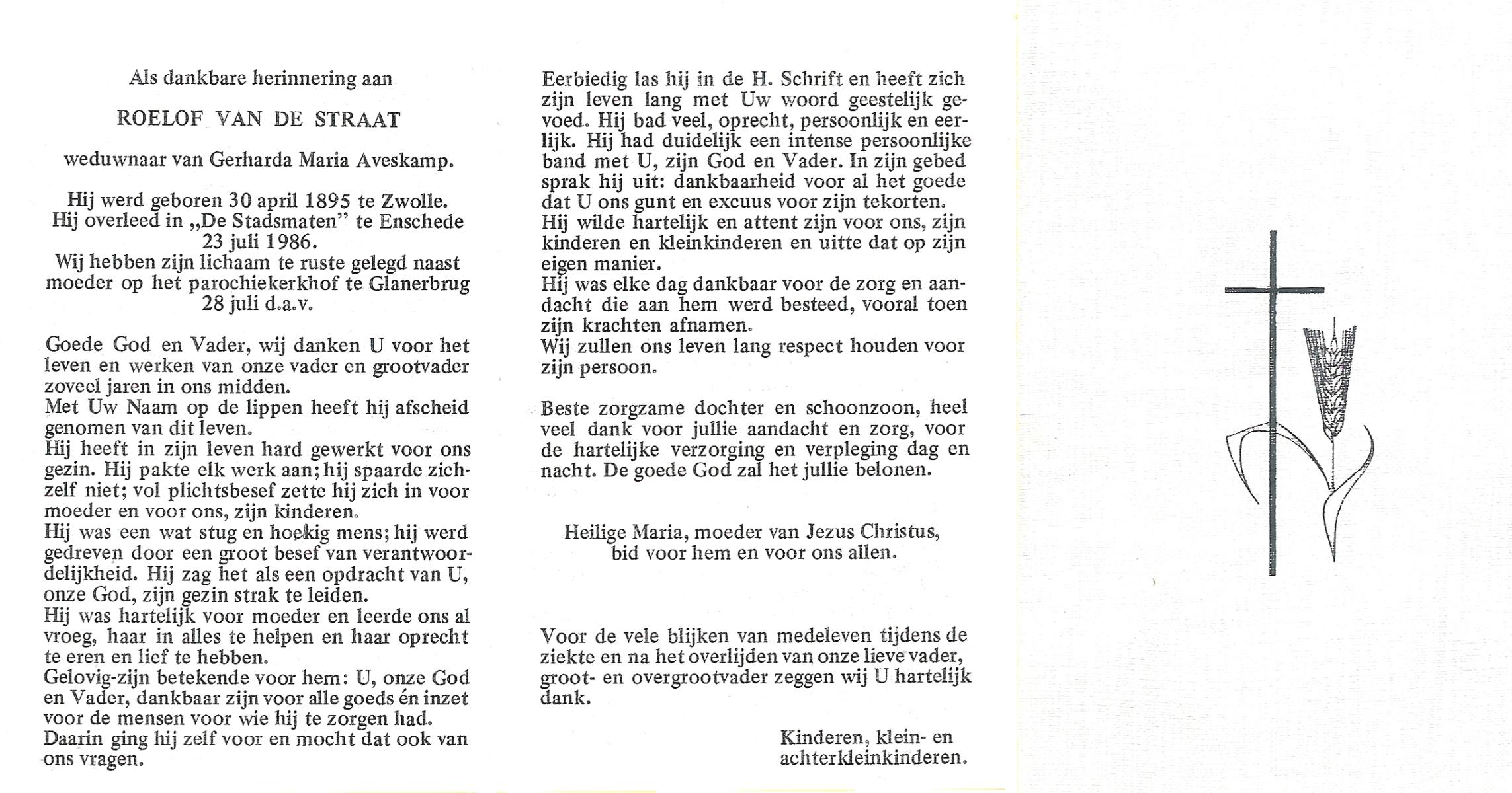 STRAAT, van de, Roelof, geboren op 30-04-1895 te Zwolle, overleden op 23-7-1986 te Enschede op 91-jarige leeftijd, begraven op 28-7-1986 te Glanerbrug.