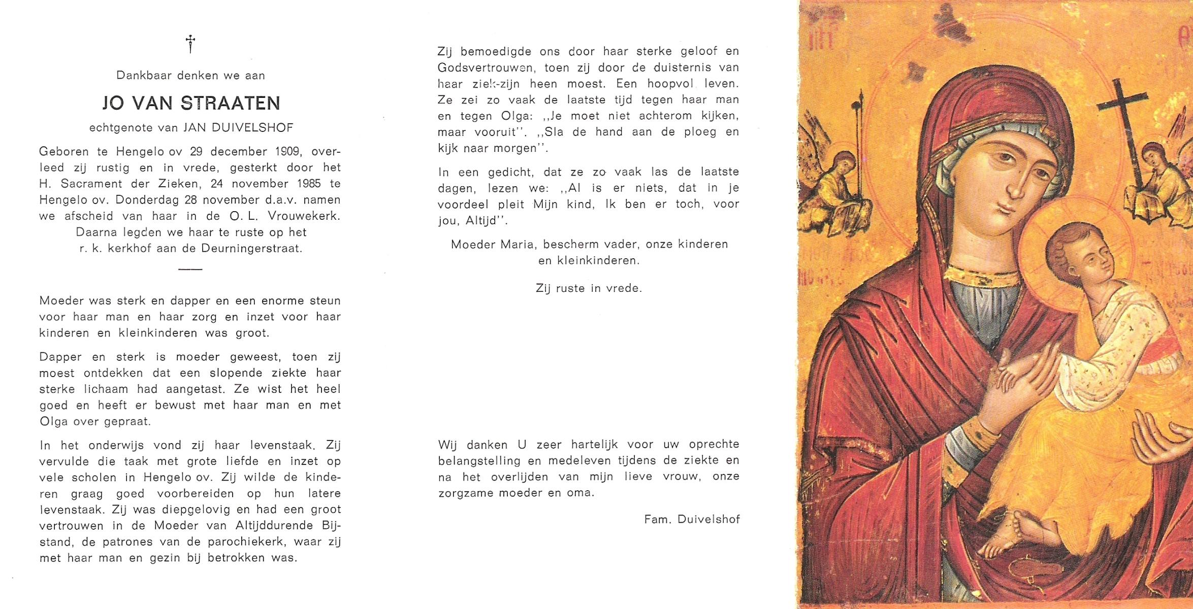 STRAATEN, van, Jo, geboren op 29-12-1909 te Hengelo (O), overleden op 24-11-1985 te Hengelo (Ov.) op 75-jarige leeftijd, begraven op 28-11-1985 te Hengelo (Ov.).