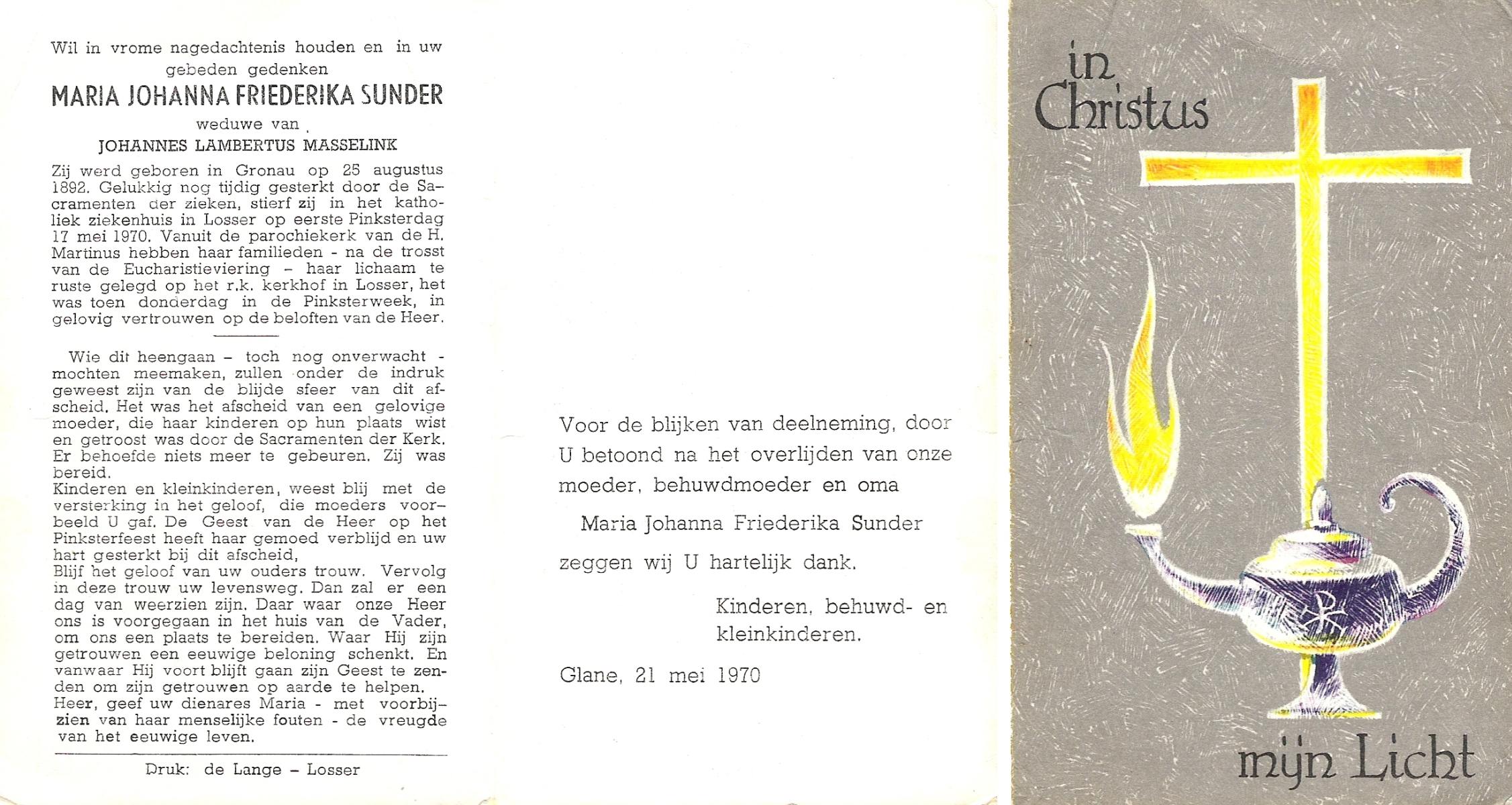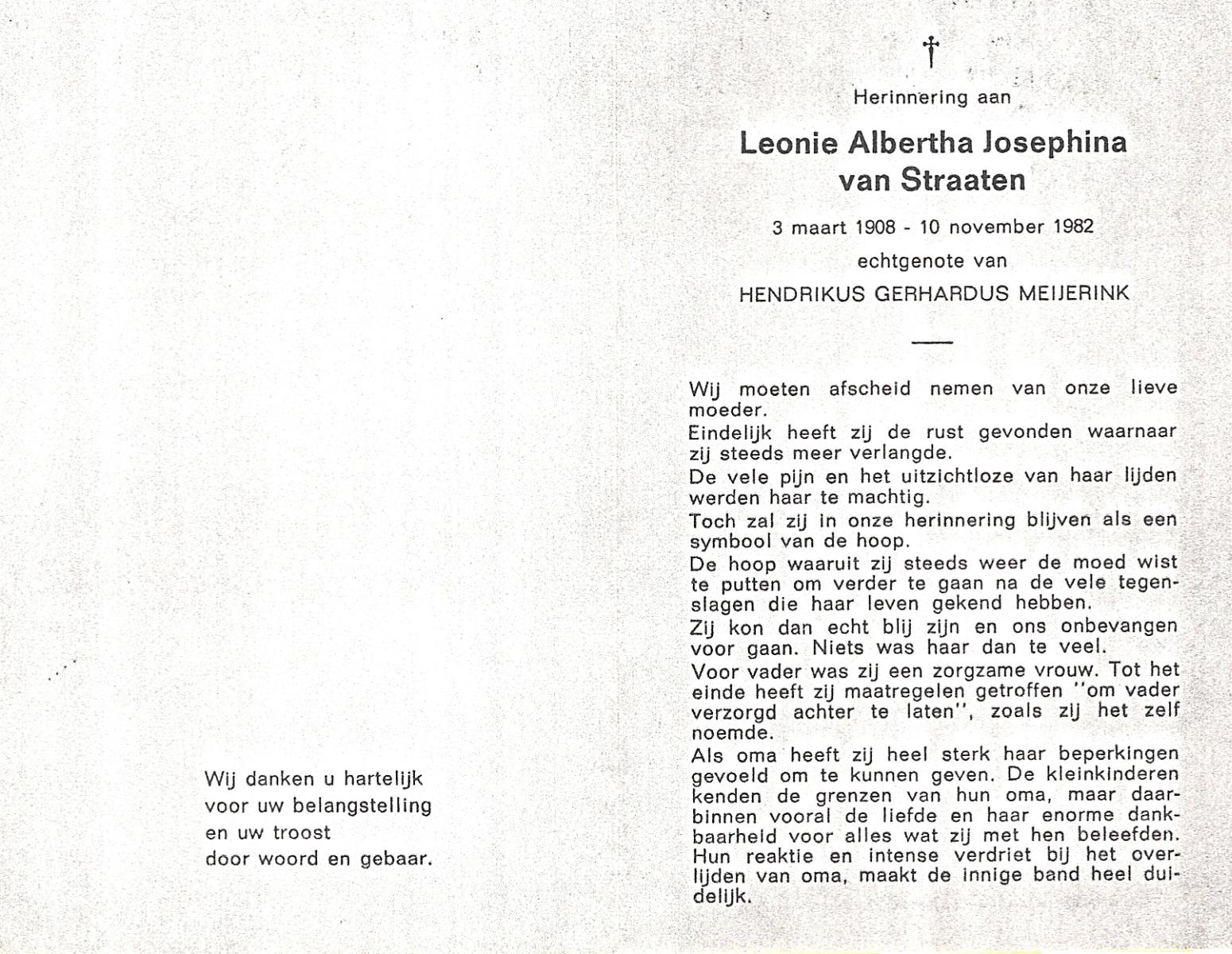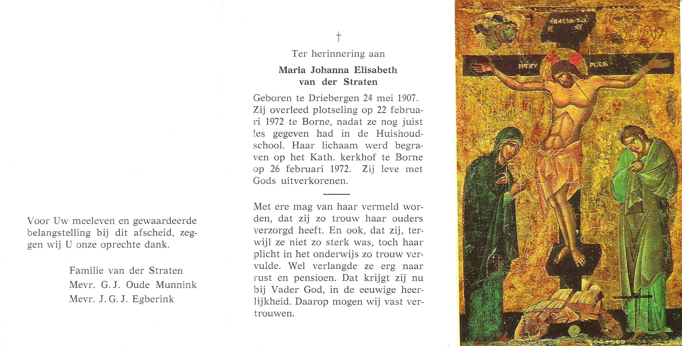 STRATEN, van der, Maria Johanna Elisabeth, geboren op 24-5-1907 te Driebergen, overleden op 22-2-1972 te Borne op 64-jarige leeftijd, begraven op 26-2-1972 te Borne.