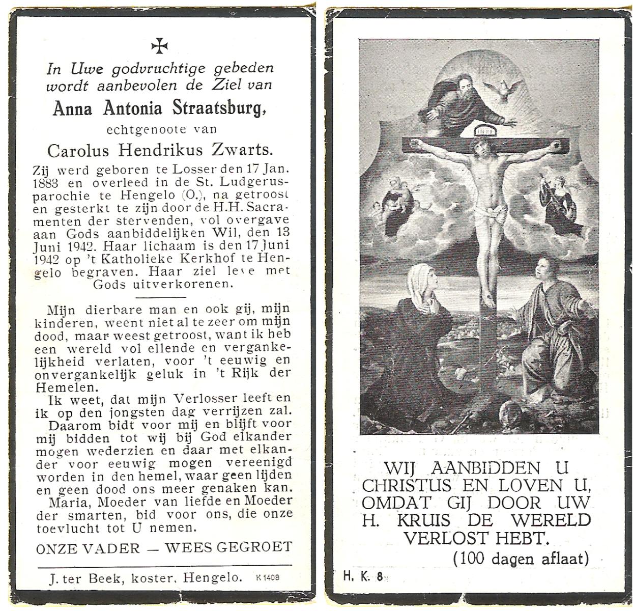 STRAATSBURG, Anna Antonia, geboren op 17-01-1883 te Losser, overleden op 13-6-1942 op 59-jarige leeftijd, begraven op 17-6-1942 te Hengelo (Ov.).