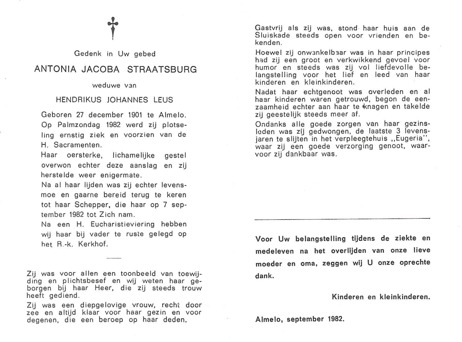 STRAATSBURG, Antonia Jacoba, geboren op 27-12-1901 te Almelo, overleden op 7-9-1982 op 80-jarige leeftijd, begraven te Almelo.