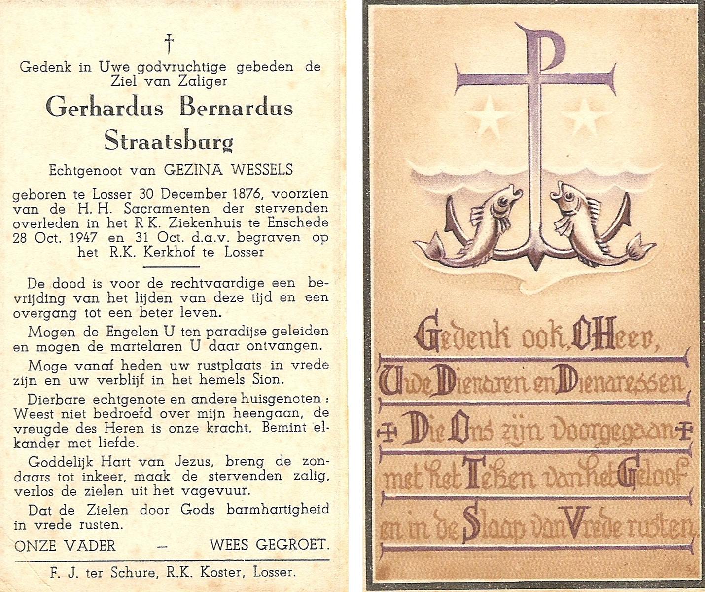 STRAATSBURG, Gerhardus Bernardus, geboren op 30-12-1876 te Losser, overleden op 28-10-1947 te Enschede op 70-jarige leeftijd, begraven op 31-10-1947 te Losser R.K.Kerkhof.