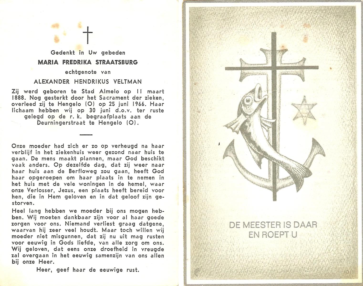 STRAATSBURG, Maria Frederika, geboren op 11-03-1888 te Almelo, Stad, overleden op 25-6-1966 te Hengelo (Ov.) op 78-jarige leeftijd, begraven op 30-6-1966 te Hengelo (Ov.).