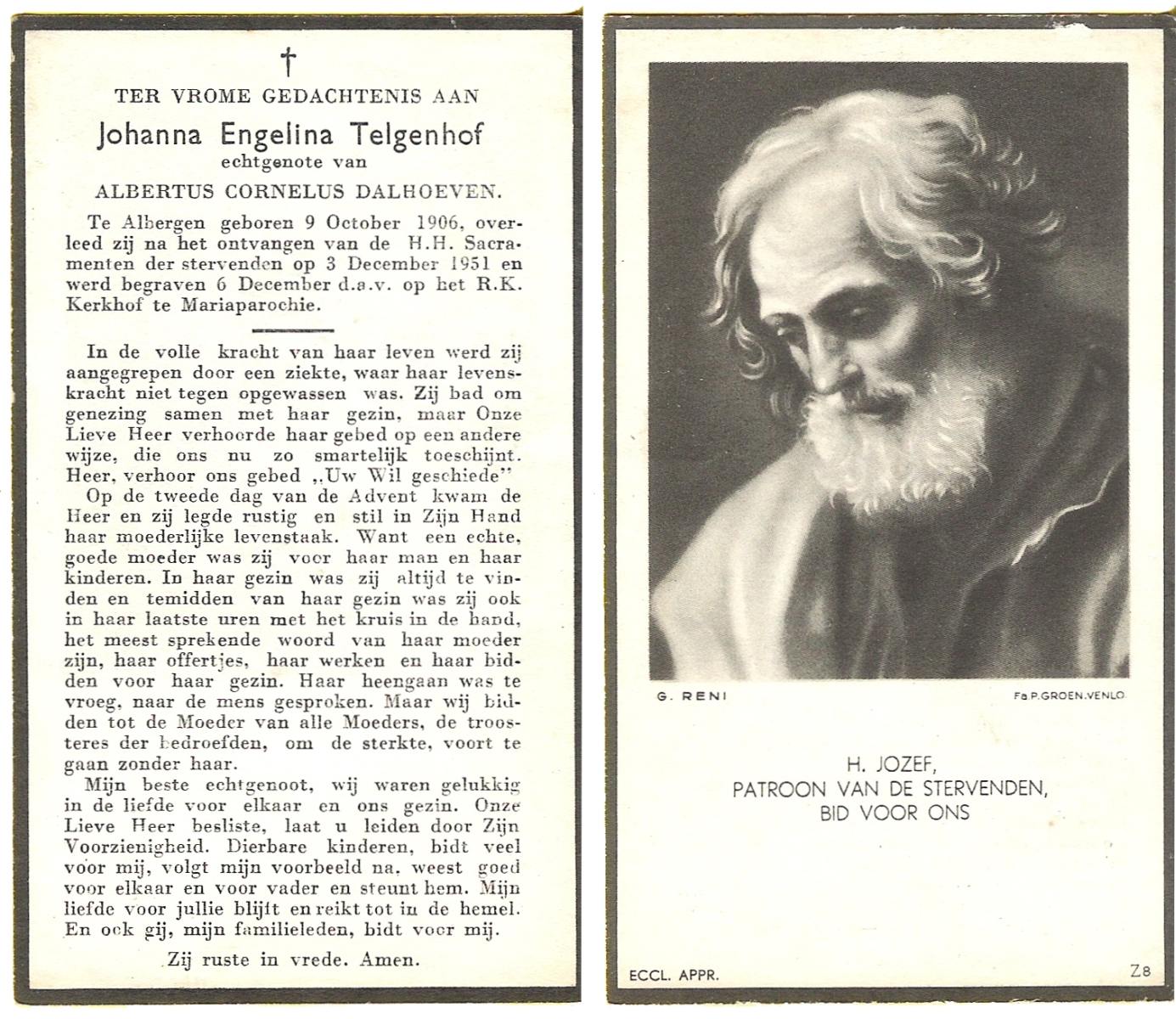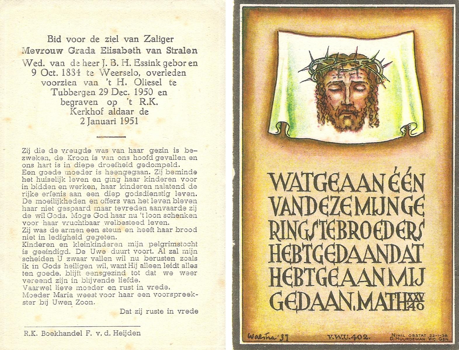 STRALEN, van, Grada Elisabeth, geboren op 09-10-1884 te Weerselo, overleden op 29-12-1950 te Tubbergen op 66-jarige leeftijd, begraven op 2-1-1951 te Tubbergen R.K.kerkhof.