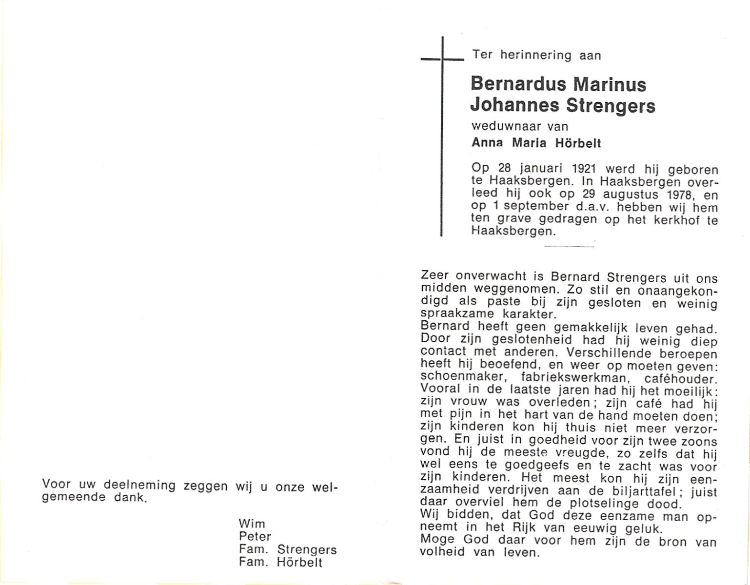 STRENGERS, Bernardus Marinus Johannes, geboren op 28-1-1921 te Haaksbergen, overleden op 29-8-1978 te Haaksbergen op 57-jarige leeftijd, begraven op 1-9-1978 te Haaksbergen.