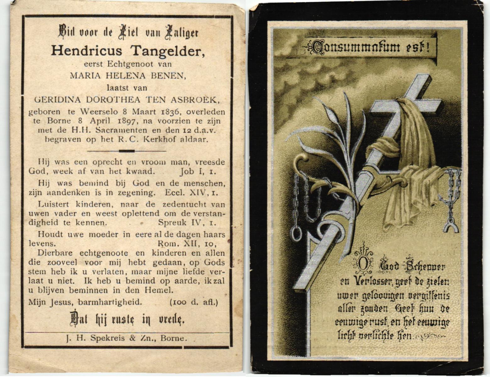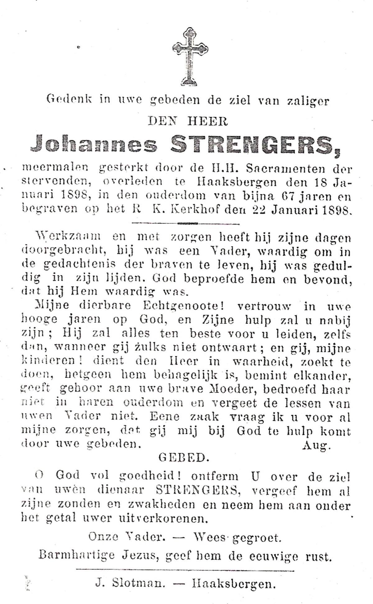 STRENGERS, Johannes, overleden op 18-01-1898 te Haaksbergen op 66-jarige leeftijd, begraven op 22-01-1898 te Haaksbergen.