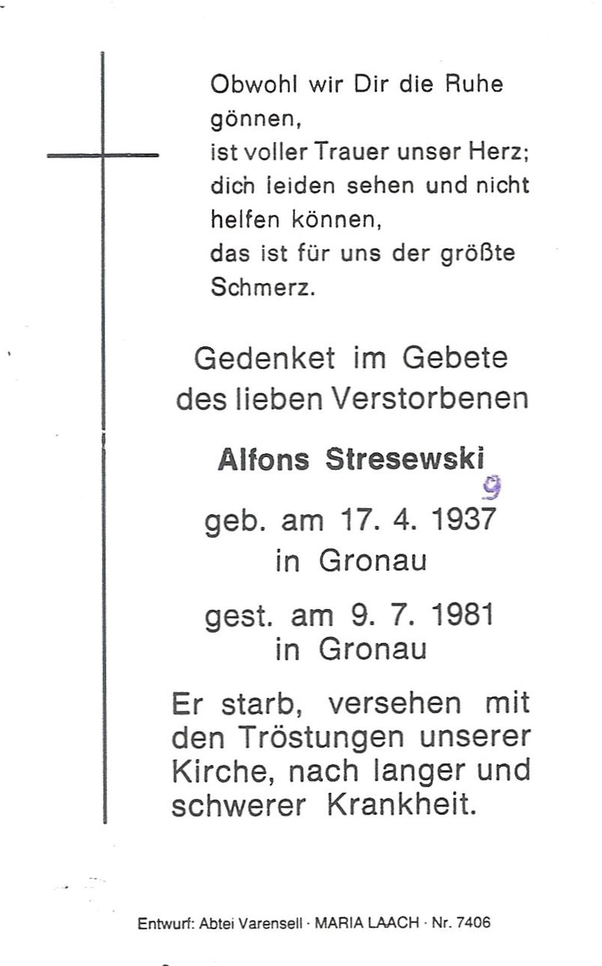 STRESEWSKI, Alfons, geboren op 17-4-1937 te Gronau (Dld.), overleden op 9-7-1981 te Gronau, Westf. (Dld.) op 44-jarige leeftijd.