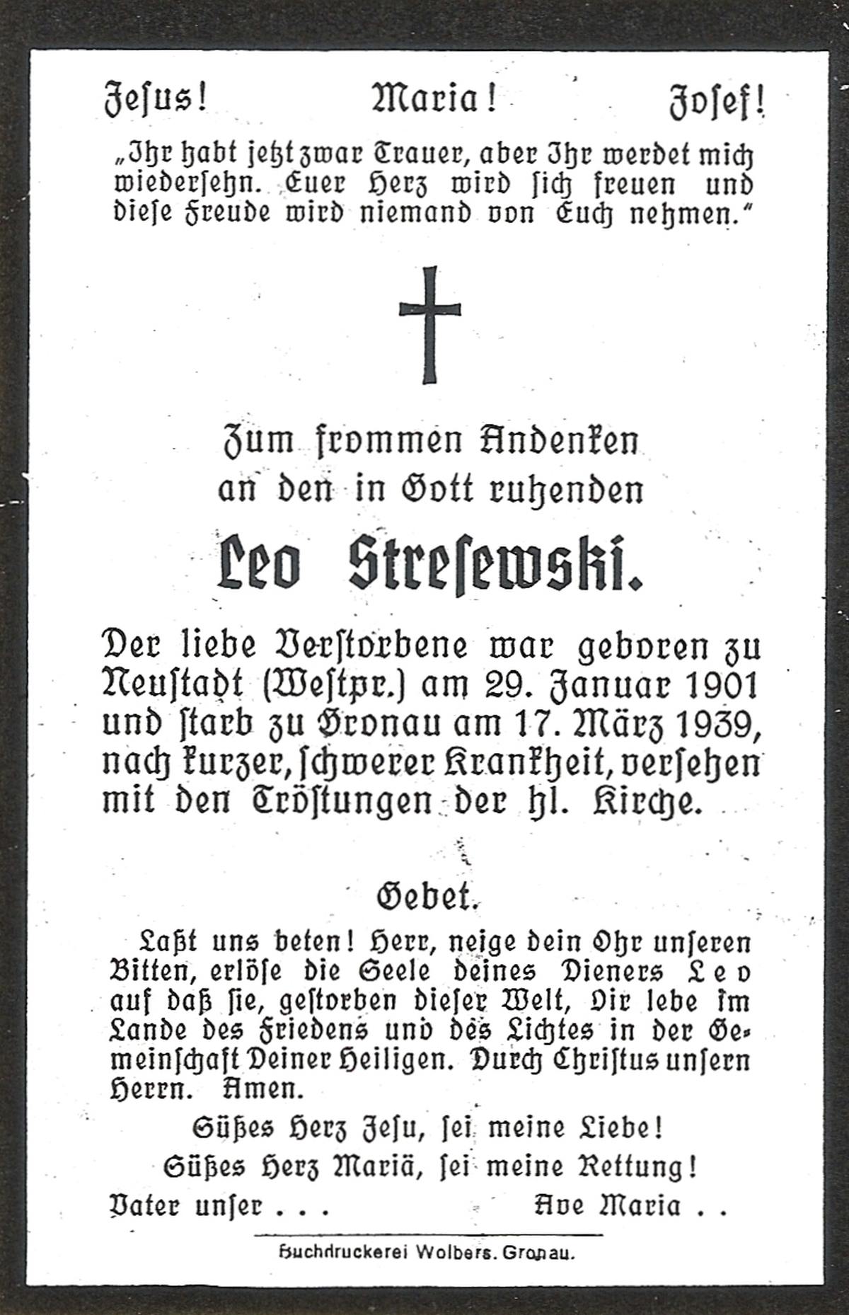 STRESEWSKI, Leo, geboren op 29-1-1901 te Neustadt, overleden op 17-3-1939 te Gronau, Westf. (Dld.) op 38-jarige leeftijd.