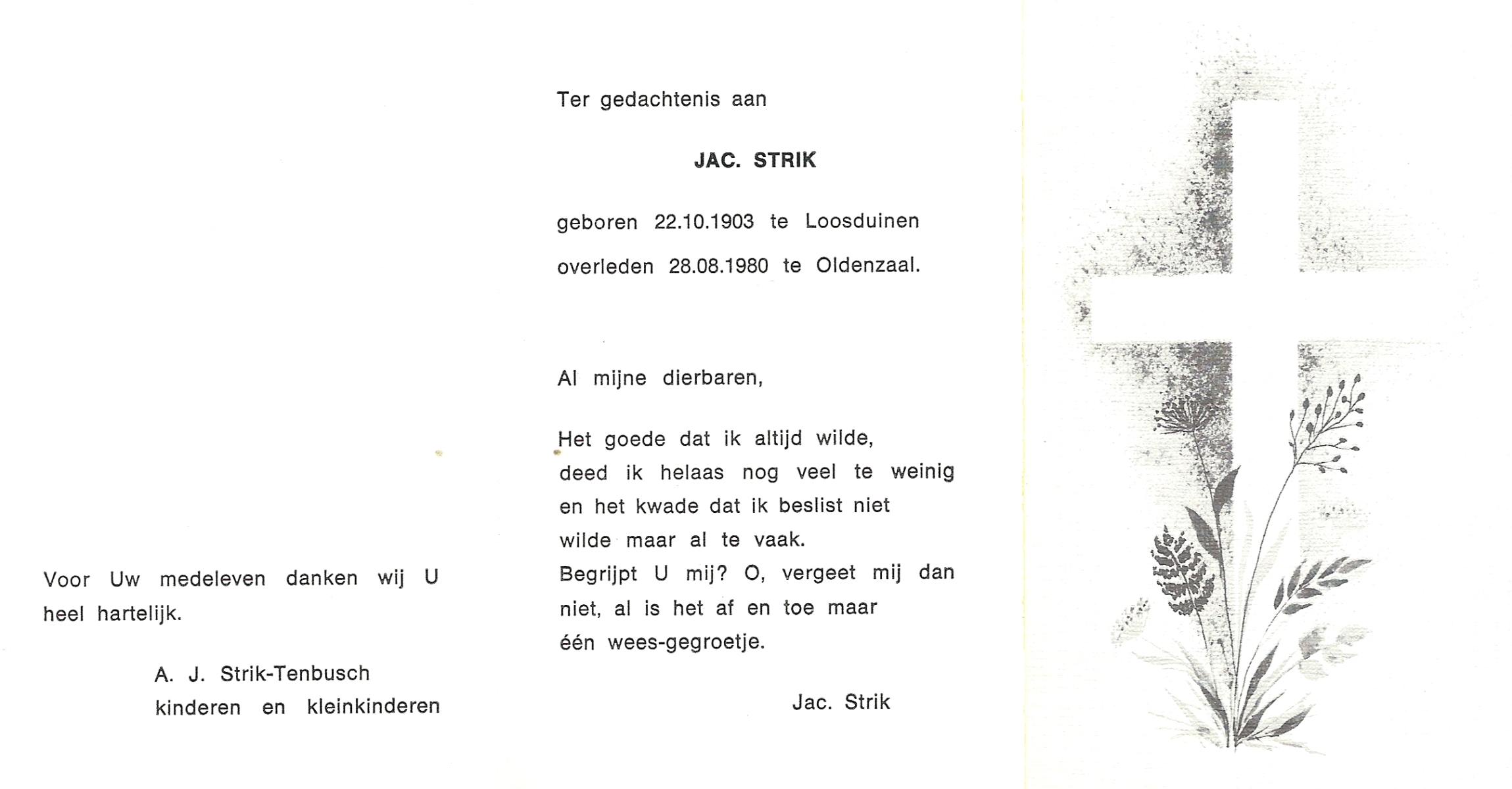STRIK, Jac., geboren op 22-10-1903 te Loosduinen, overleden op 28-8-1980 te Oldenzaal op 76-jarige leeftijd.
