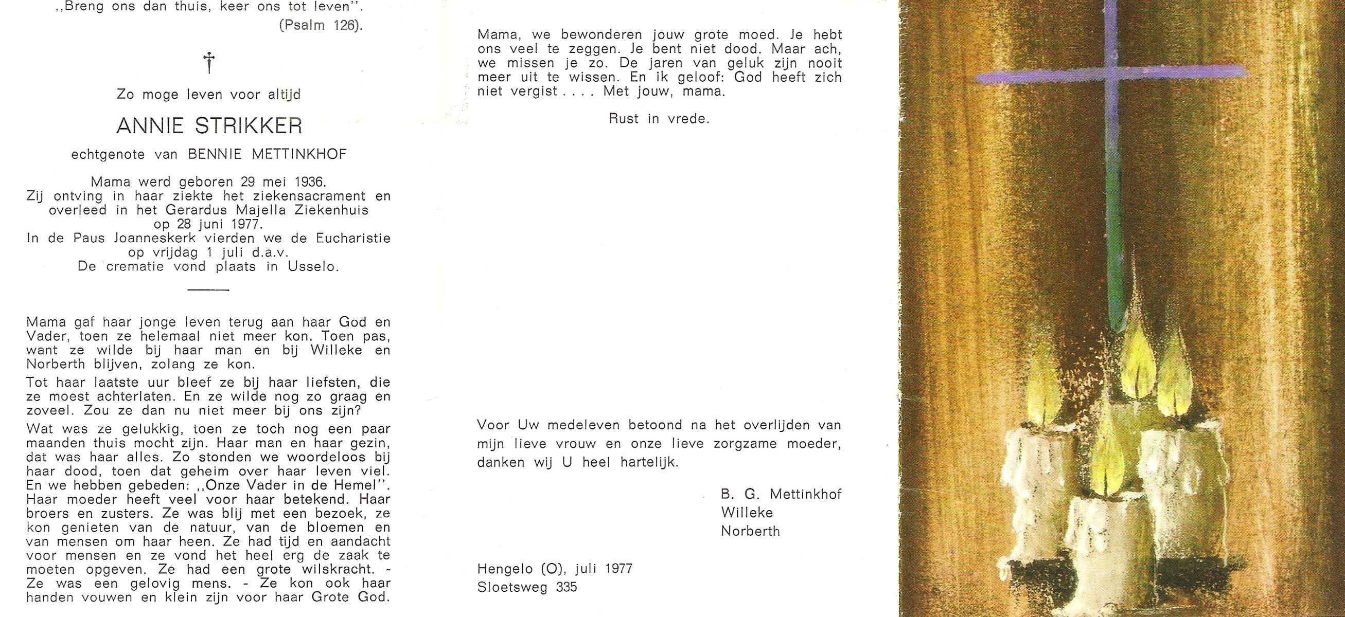 STRIKKER, Annie, geboren op 29-5-1936, overleden op 28-8-1977 te Hengelo (Ov.) op 41-jarige leeftijd, gecremeerd te Usselo.