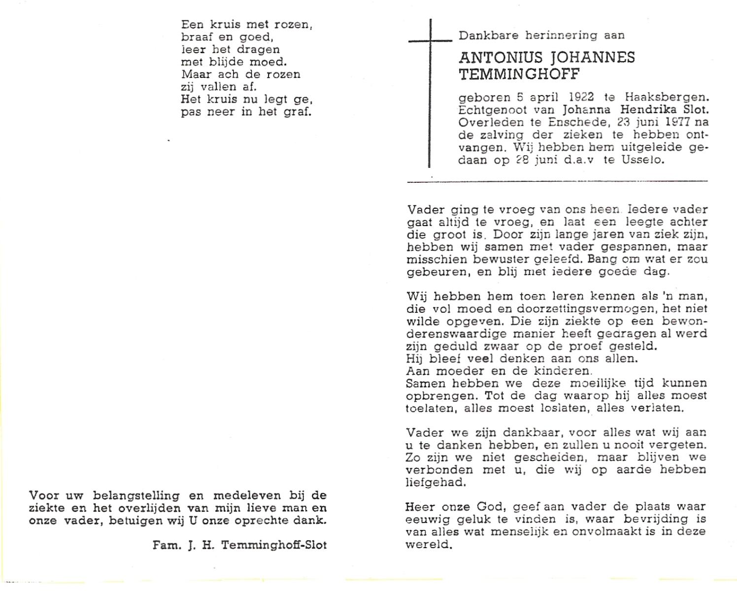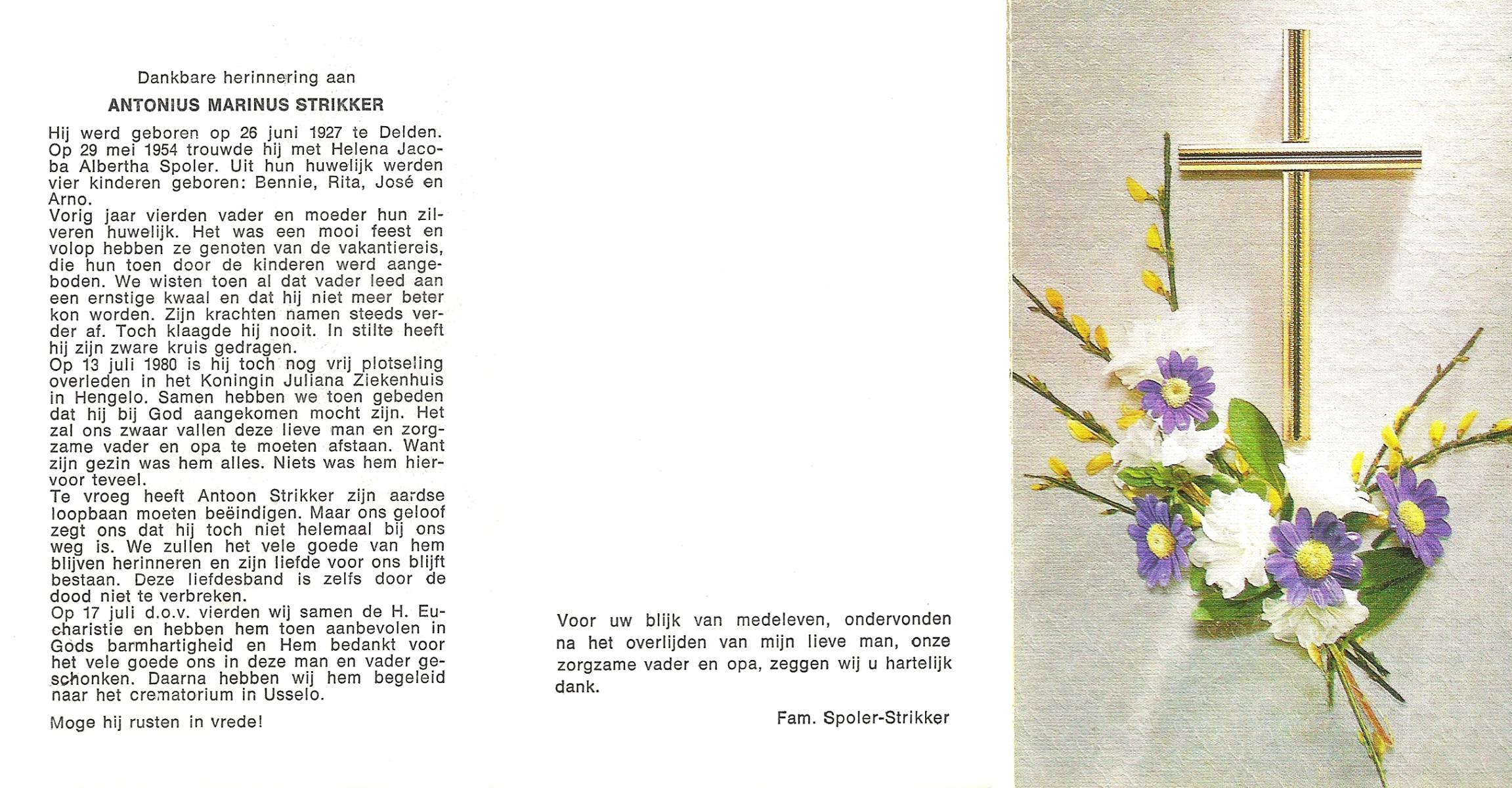 STRIKKER, Antonius Marinus, geboren op 26-6-1927 te Delden, overleden op 13-7-1980 te Hengelo (Ov.) op 53-jarige leeftijd, gecremeerd op 17-7-1980 te Usselo.
