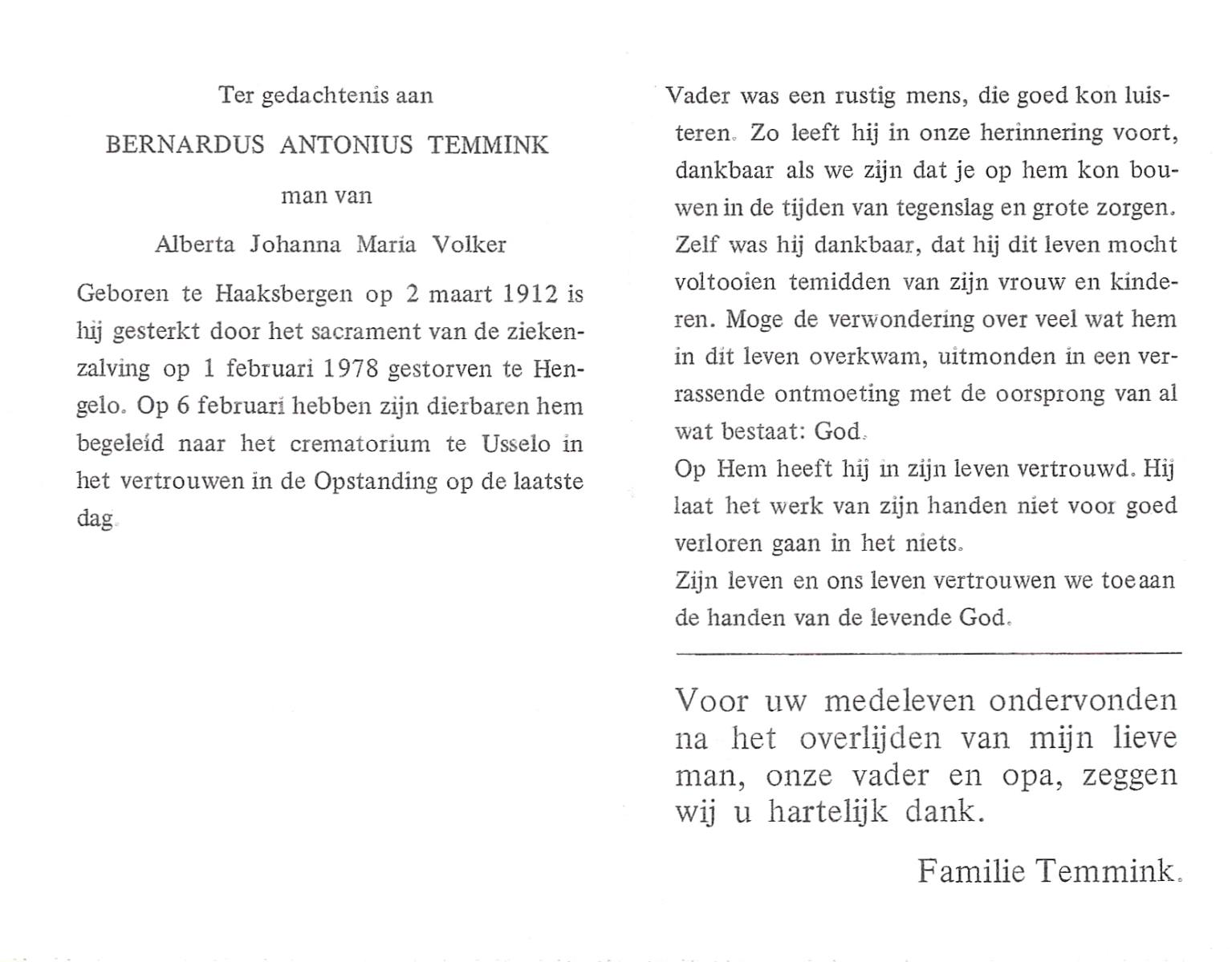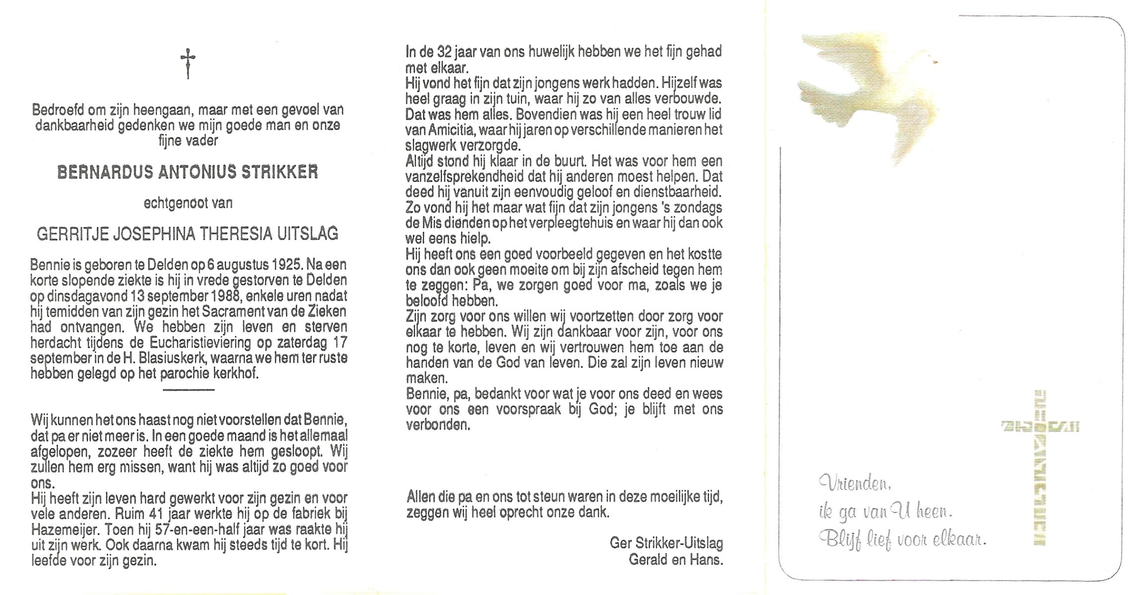 STRIKKER, Bernardus Antonius, geboren op 6-8-1925 te Delden, overleden op 13-9-1988 te Delden op 63-jarige leeftijd, begraven op 17-9-1988 te Delden.