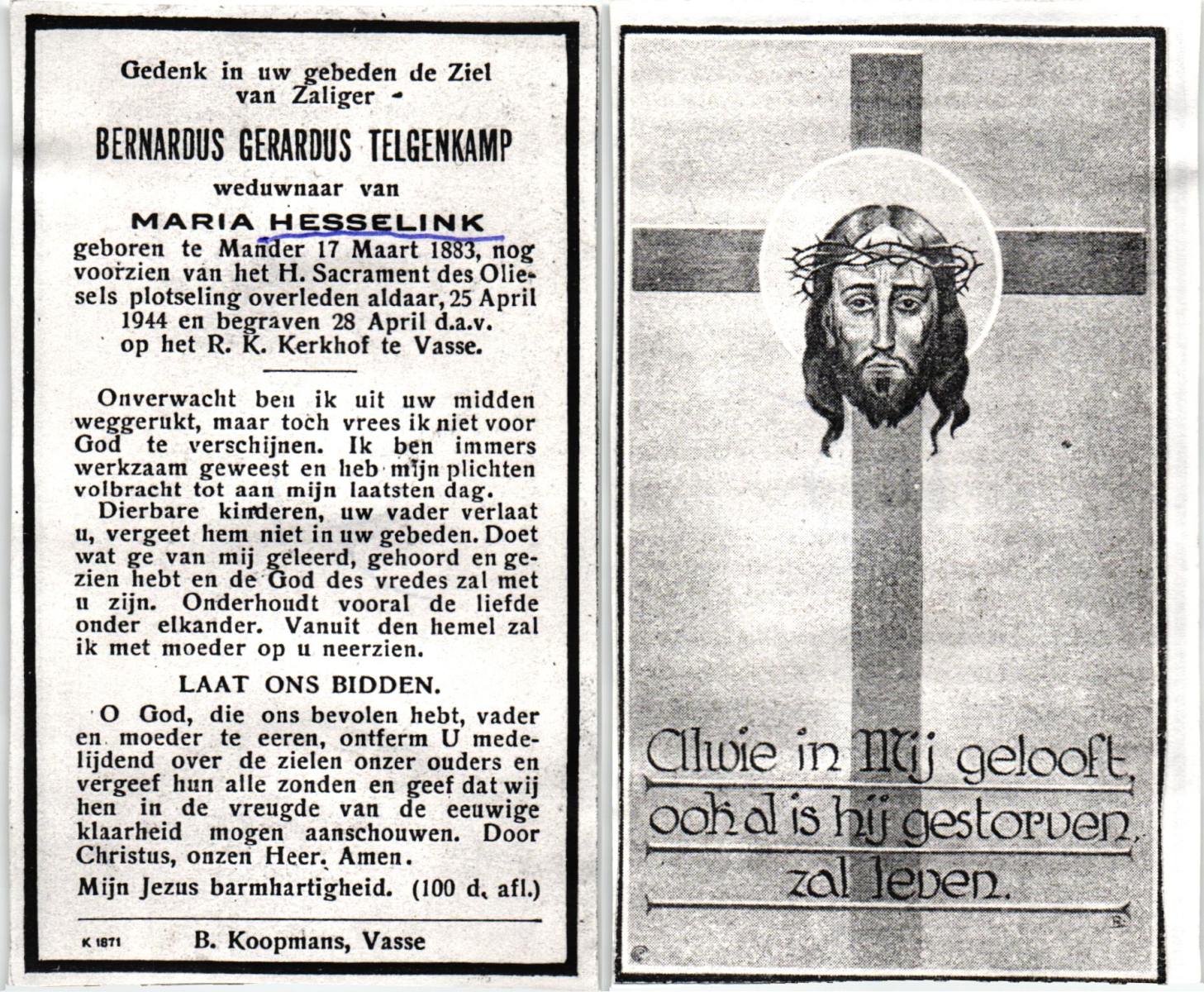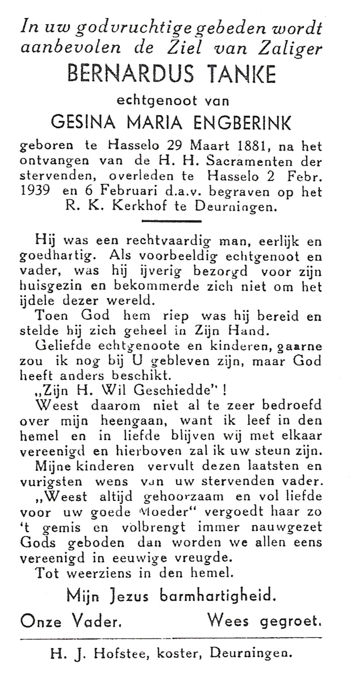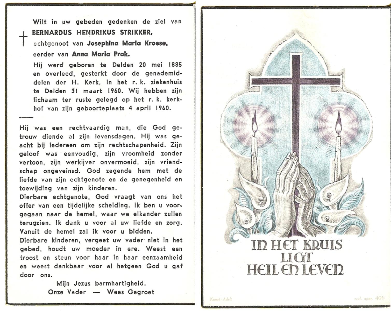 STRIKKER, Bernardus Hendrikus, geboren op 20-05-1885 te Delden, overleden op 31-3-1960 te Delden op 74-jarige leeftijd, begraven op 4-4-1960 te Delden parochie-kerkhof H.Blasius.
