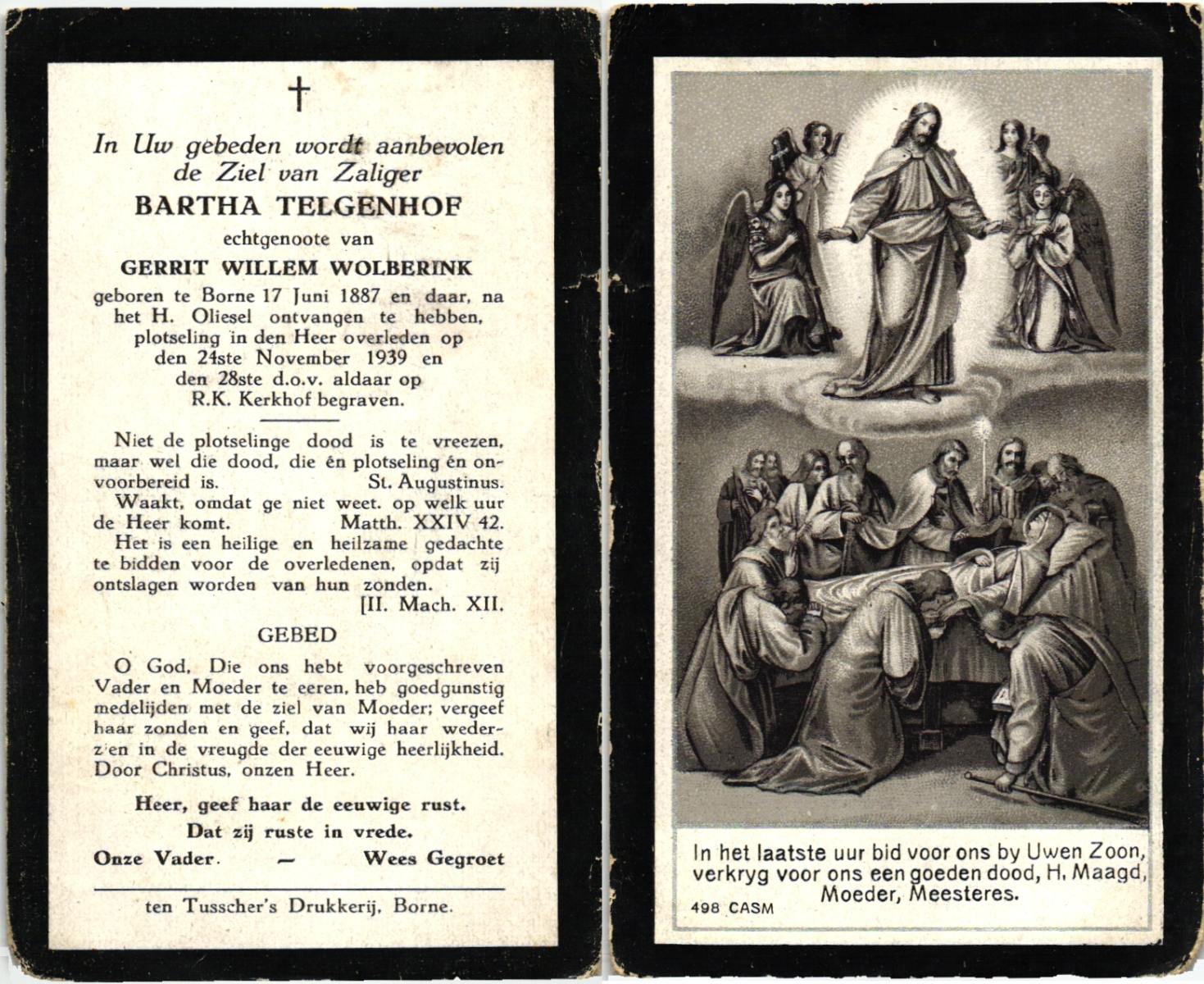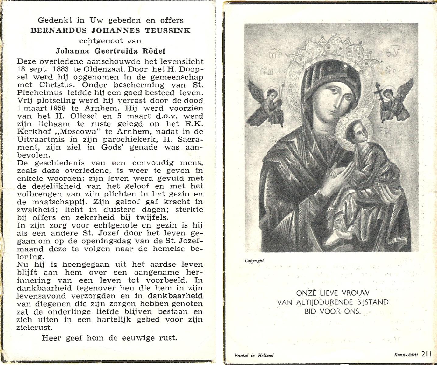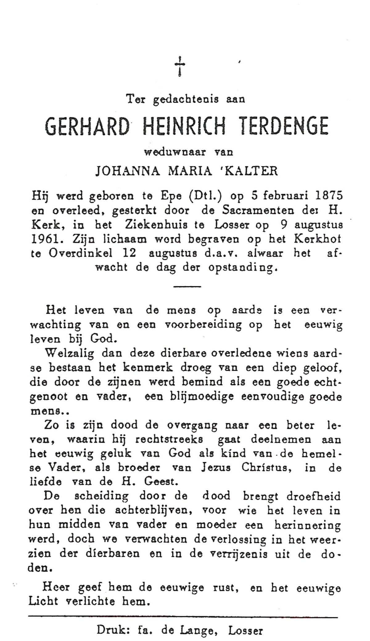 STRIKKER, Bernardus Hendrikus, geboren op 20-05-1885 te Delden, overleden op 31-3-1960 te Delden op 74-jarige leeftijd, begraven op 4-4-1960 te Delden parochie-kerkhof H.Blasius.