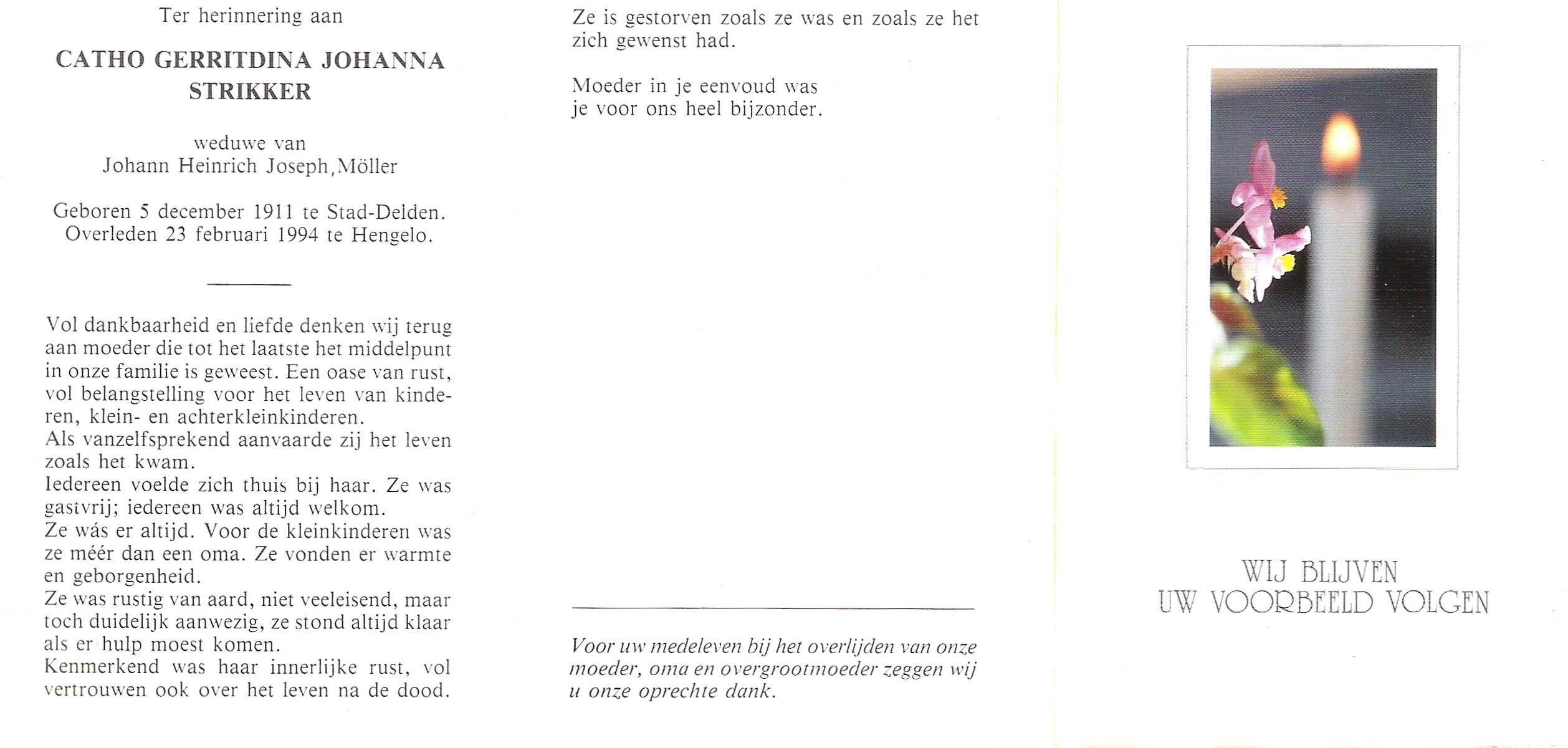 STRIKKER, Catho Gerritdina Johanna, geboren op 5-12-1911 te Delden, Stad, overleden op 23-2-1994 te Hengelo (Ov.) op 82-jarige leeftijd.