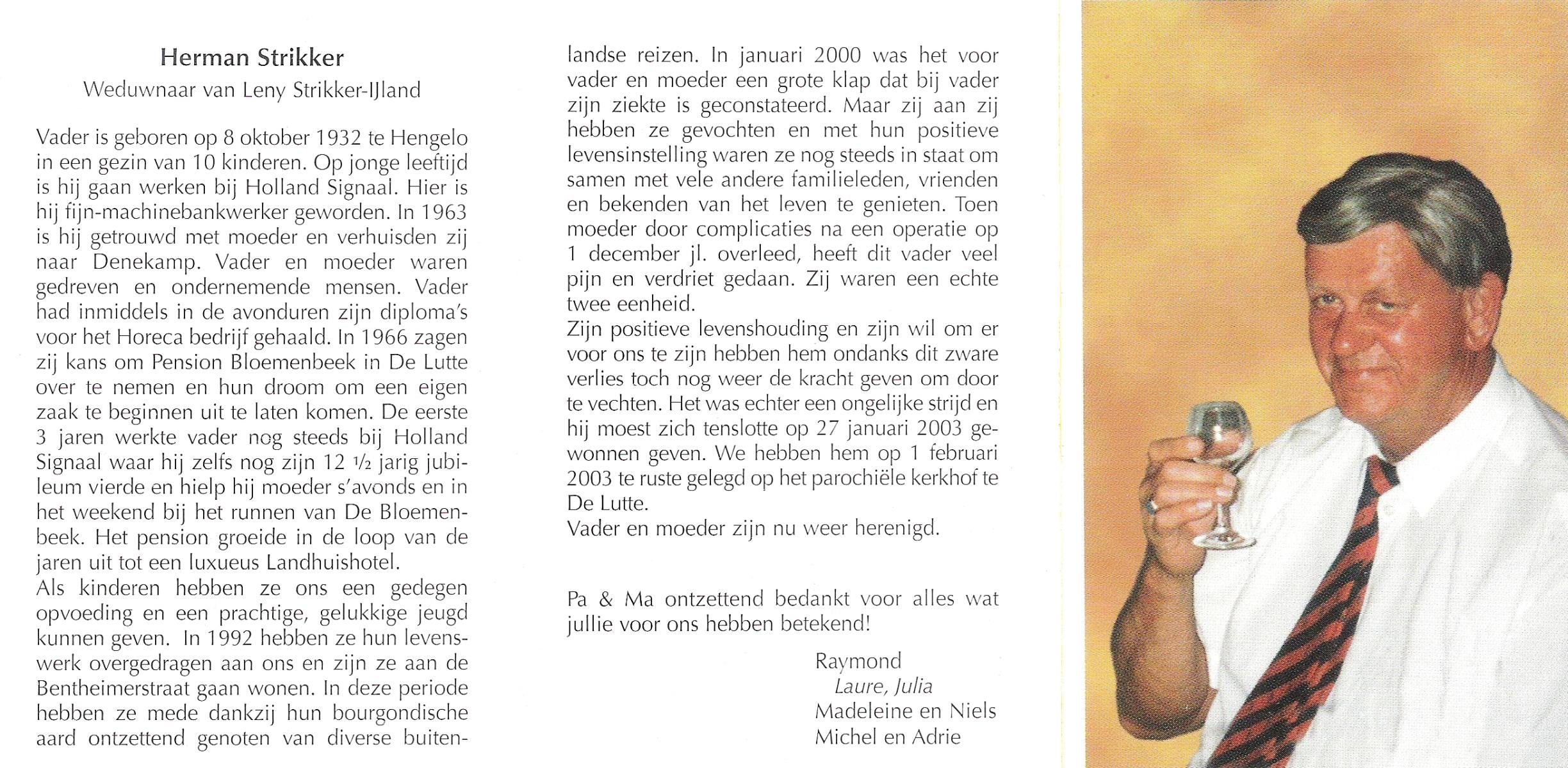 STRIKKER, Herman, geboren op 8-10-1932 te Hengelo (O), overleden op 27-1-2003 op 70-jarige leeftijd, begraven op 1-2-2003 te De Lutte.