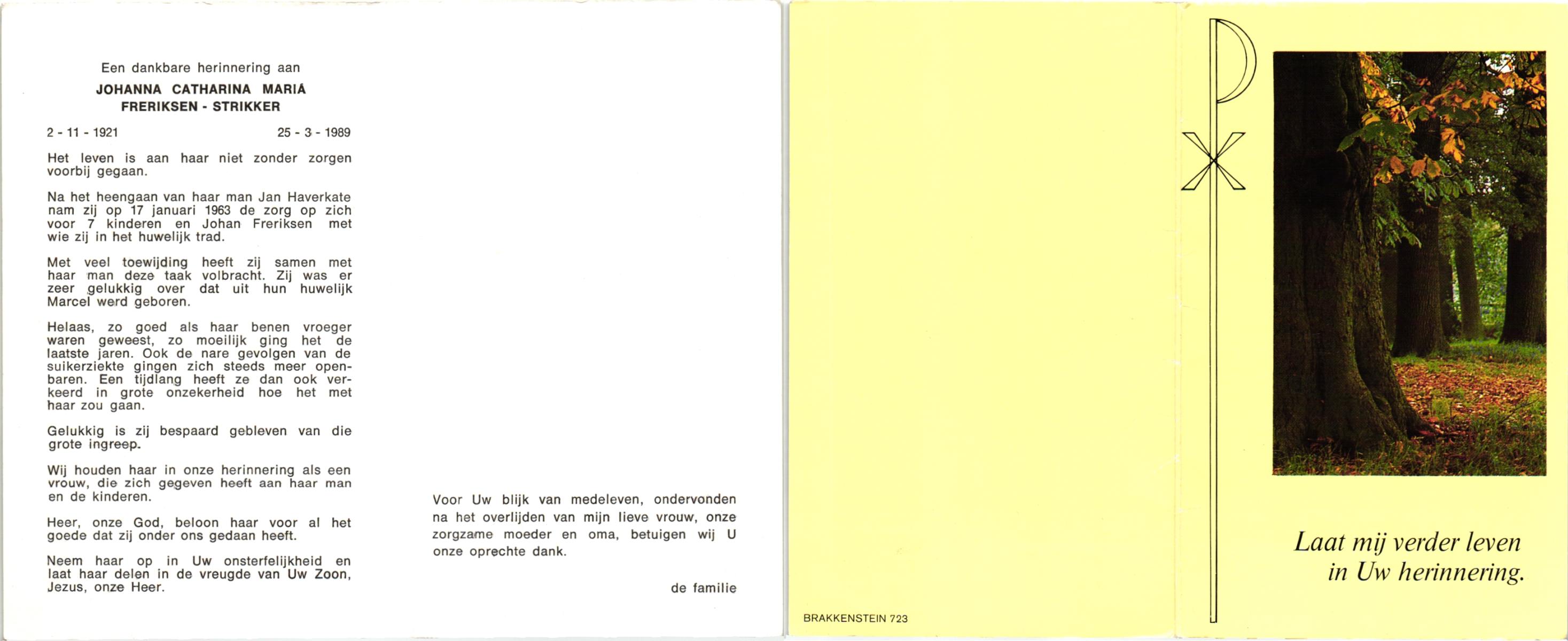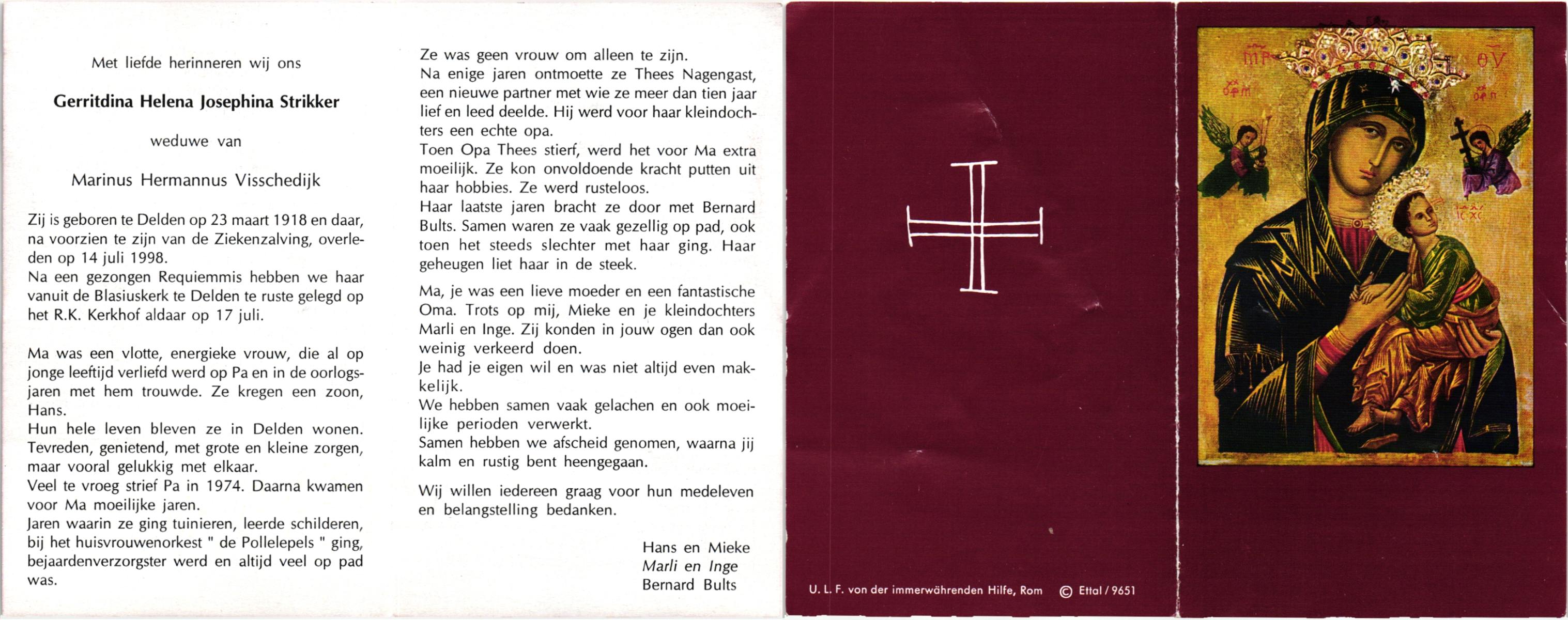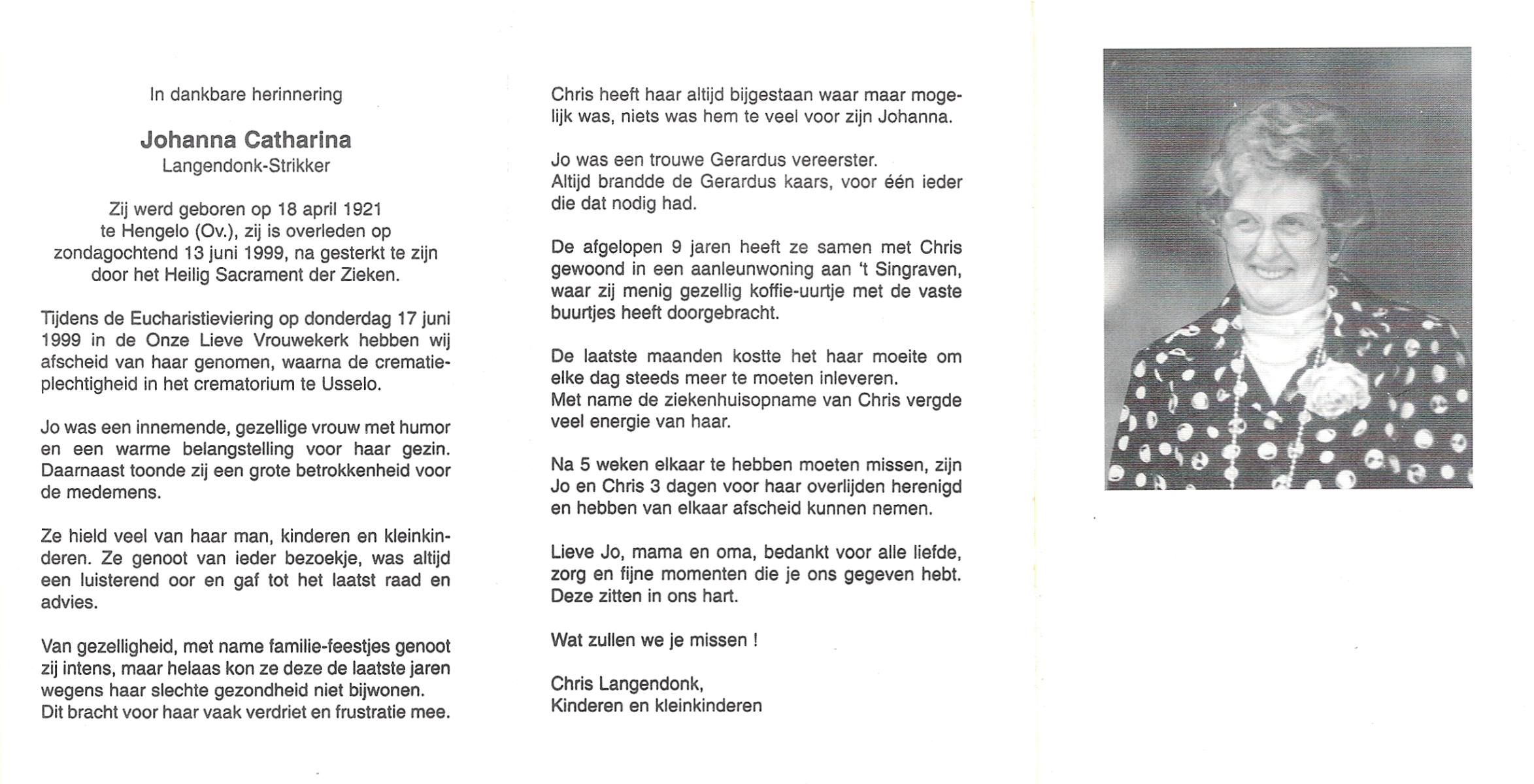 STRIKKER, Johanna Catharina, geboren op 18-4-1921 te Hengelo (O), overleden op 13-6-1999 te Hengelo (Ov.) op 78-jarige leeftijd, gecremeerd op 17-6-1999 te Usselo.