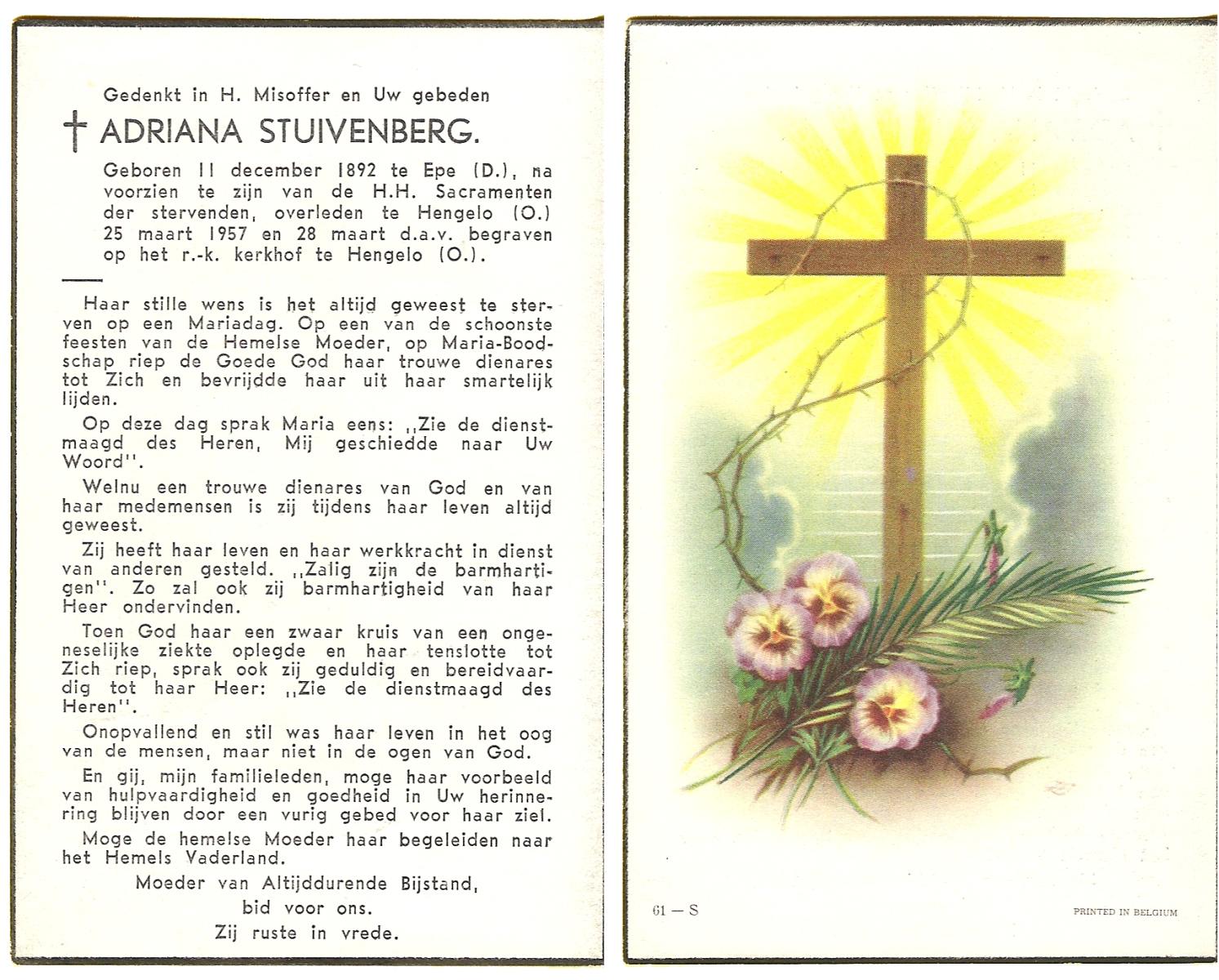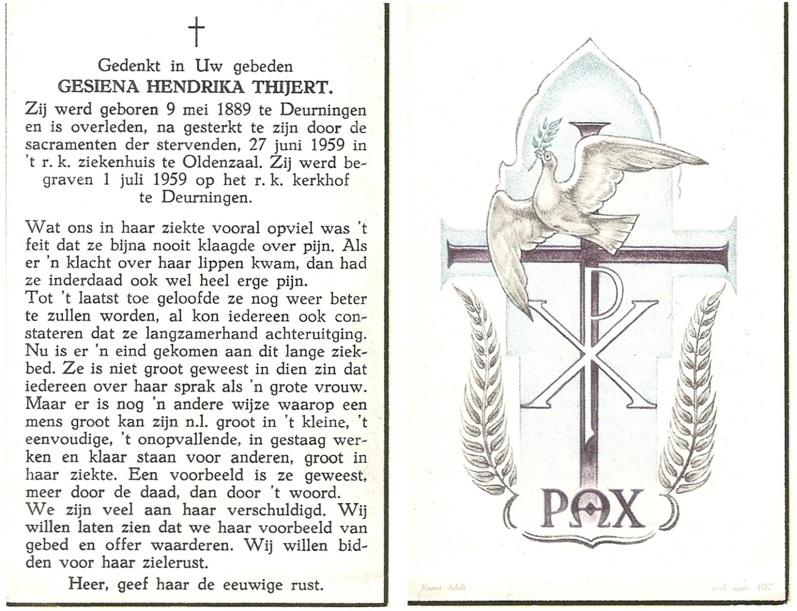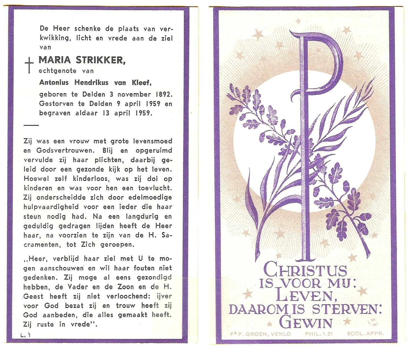 STRIKKER, Maria, geboren op 03-11-1892 te Delden, overleden op 9-4-1959 te Delden op 66-jarige leeftijd, begraven op 13-4-1959 te Delden.