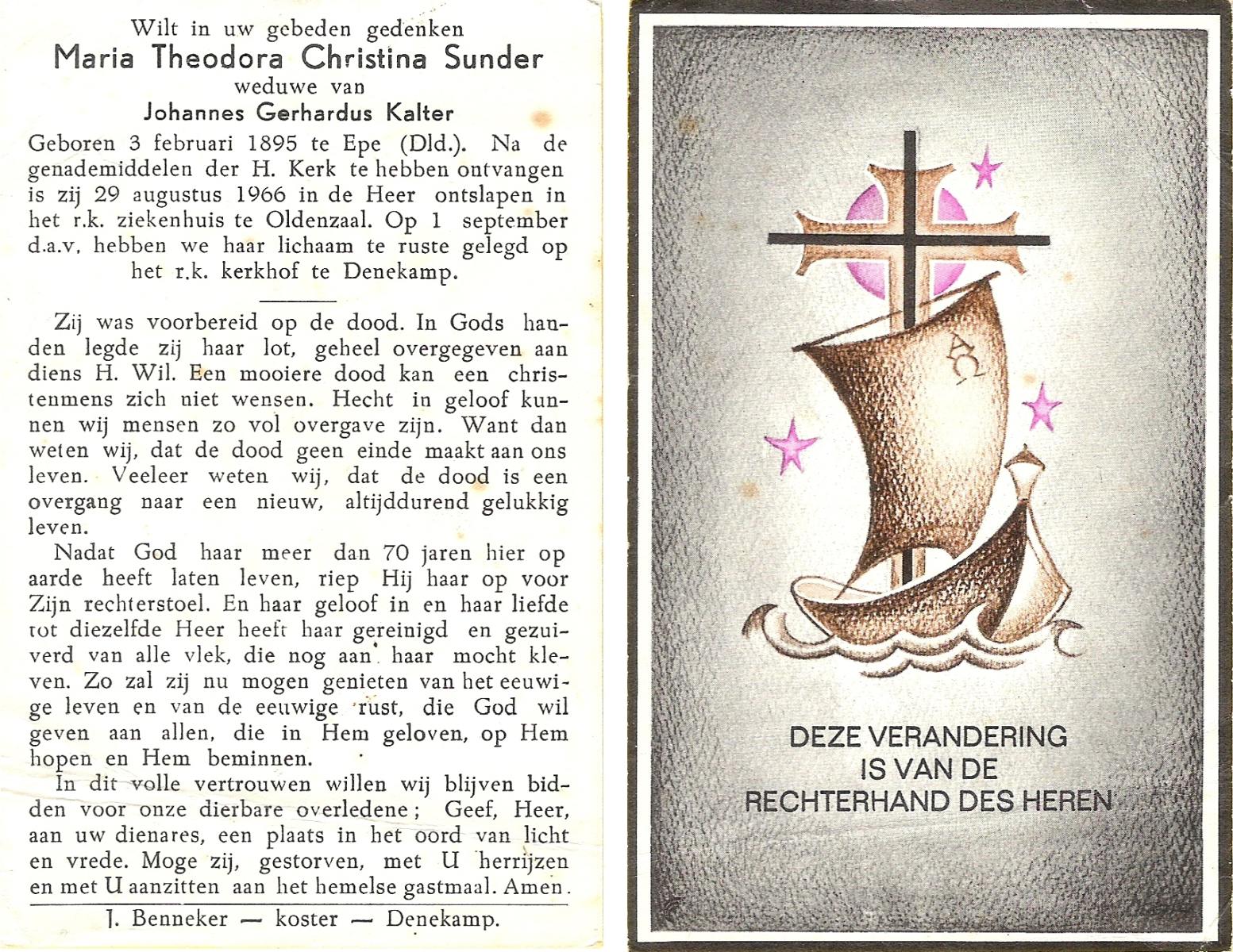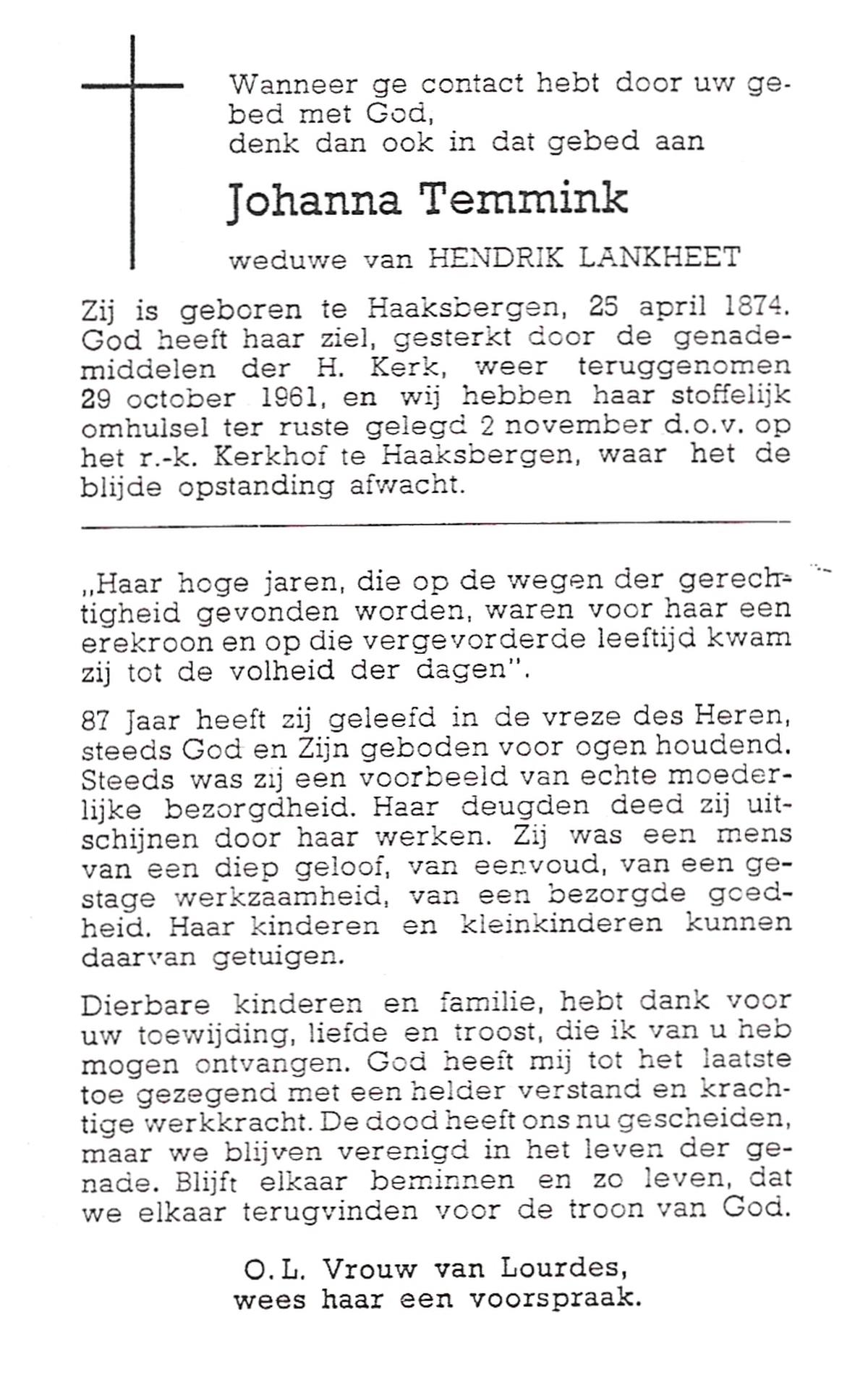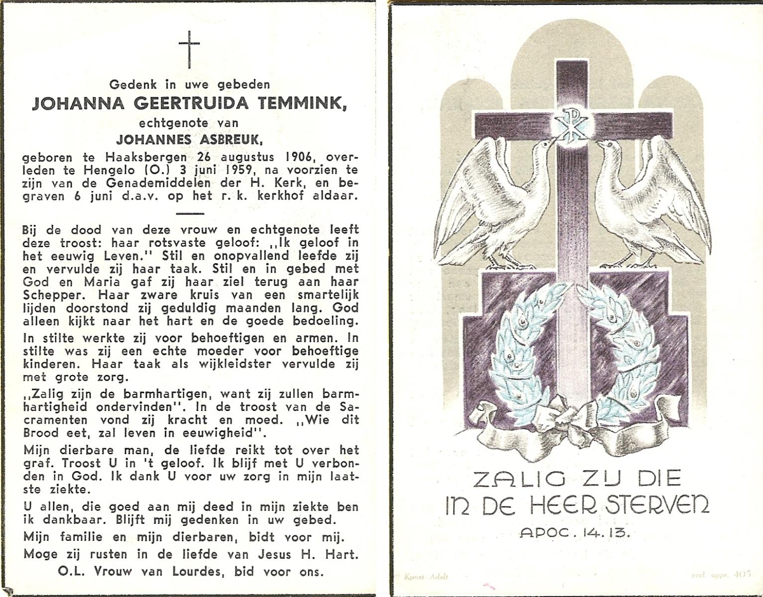 STRIKKER, Maria, geboren op 03-11-1892 te Delden, overleden op 9-4-1959 te Delden op 66-jarige leeftijd, begraven op 13-4-1959 te Delden.