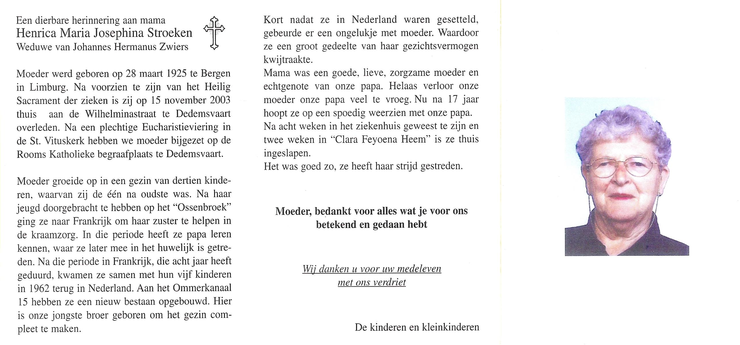 STROEKEN, Henrica Maria Josephina, geboren op 28-3-1925 te Bergen (L), overleden op 15-11-2003 te Dedemsvaart op 78-jarige leeftijd, begraven te Dedemsvaart.