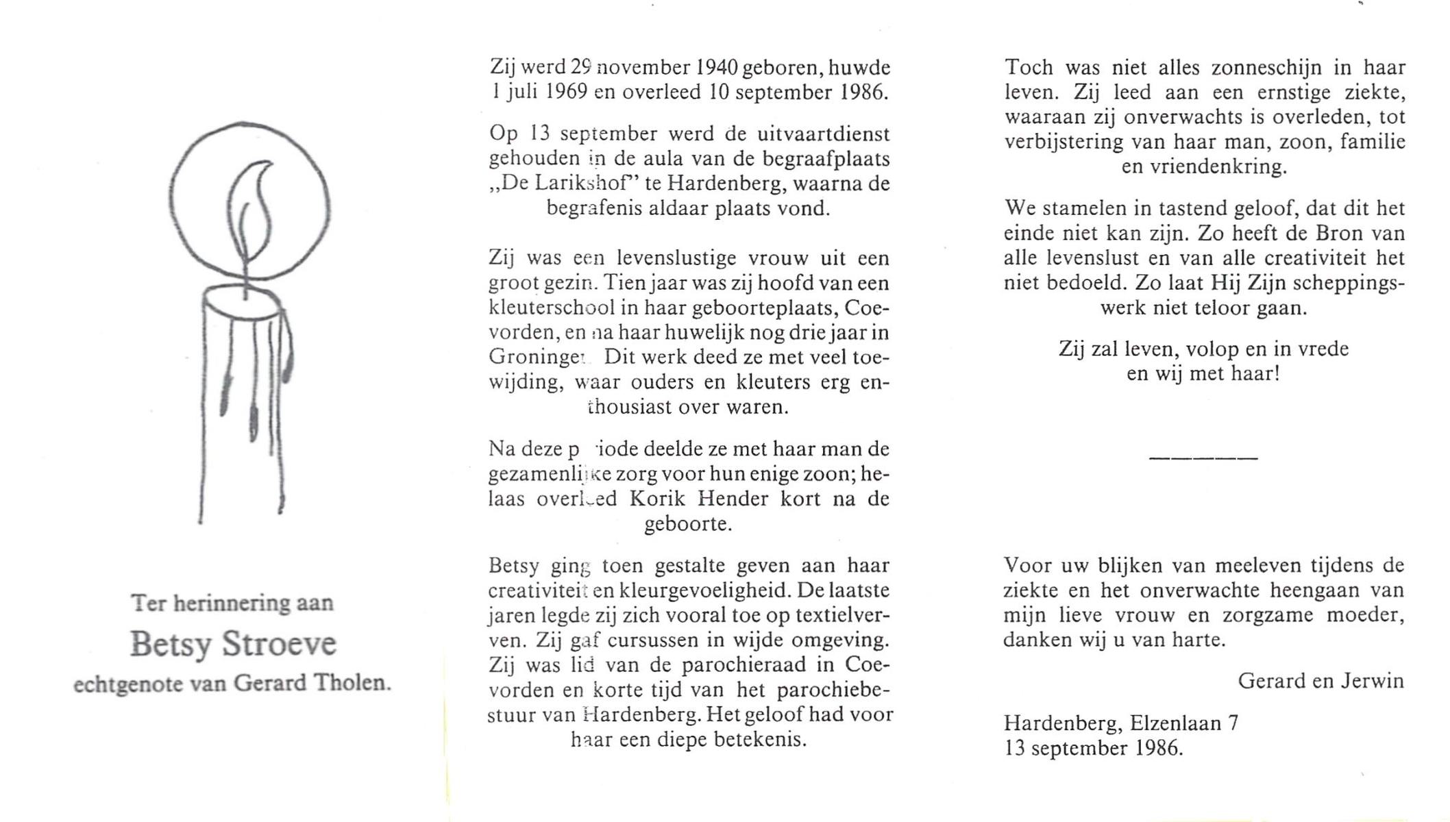STROEVE, Betsy, geboren op 29-11-1940, overleden op 10-9-1986 op 45-jarige leeftijd, begraven op 13-9-1986 te Hardenberg.