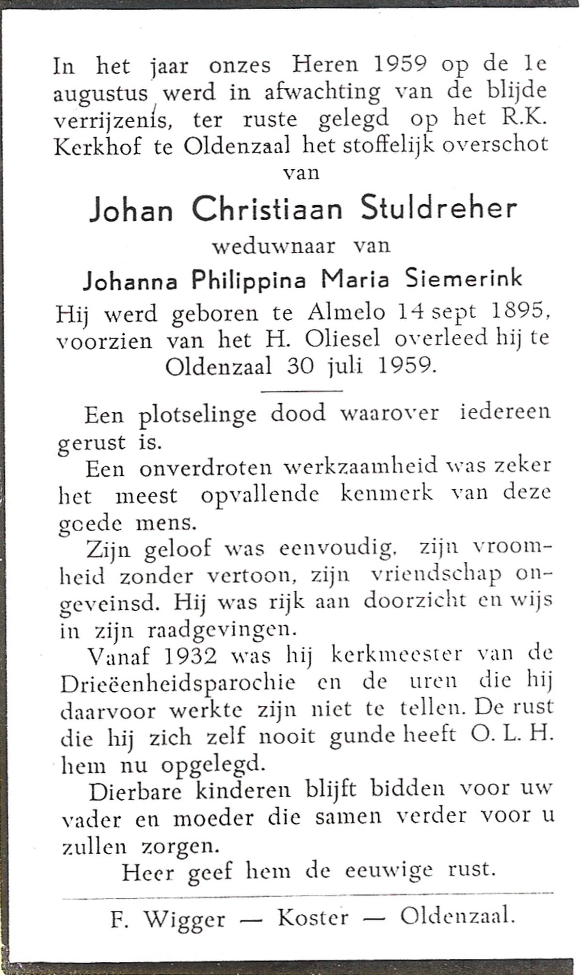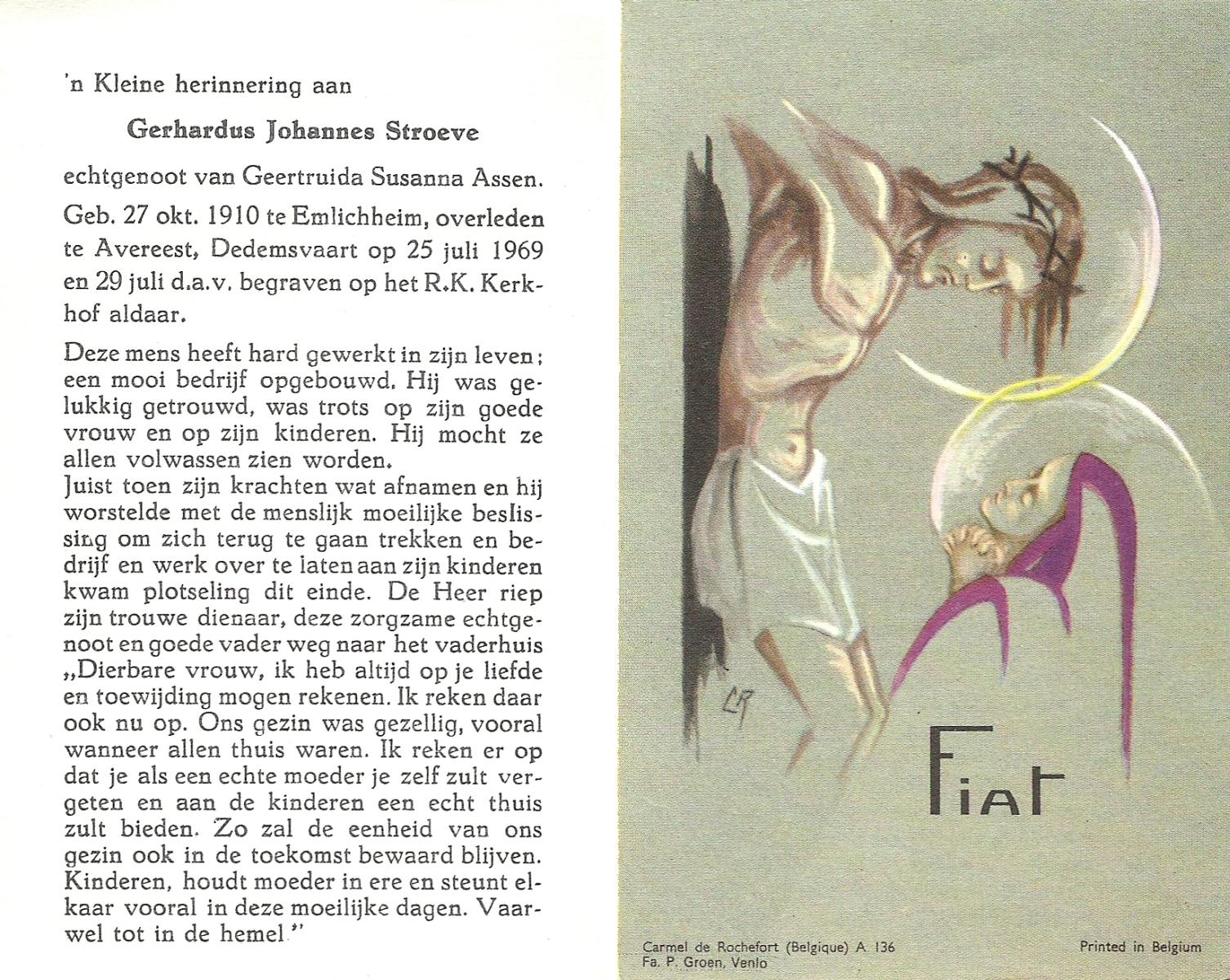 STROEVE, Gerhardus Johannes, geboren op 27-10-1910 te Emlichheim (Dld.), overleden op 25-7-1969 te Avereest Dedemsvaart op 58-jarige leeftijd, begraven op 29-7-1969 te Avereest Dedemsvaart.